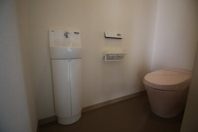 【トイレ】・・・ 掃除のしやすいアクアセラミック仕様、節水型タンクレストイレ、サティスSをご採用いただきました。