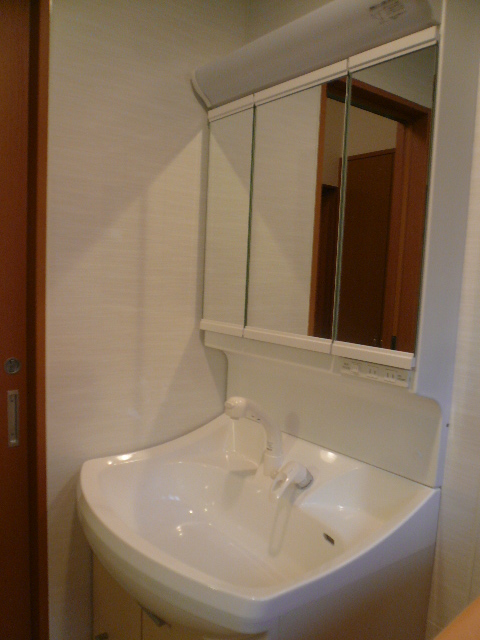 洗面化粧台は、収納付きの三面鏡なので、細々したものもスッキリしまえます。