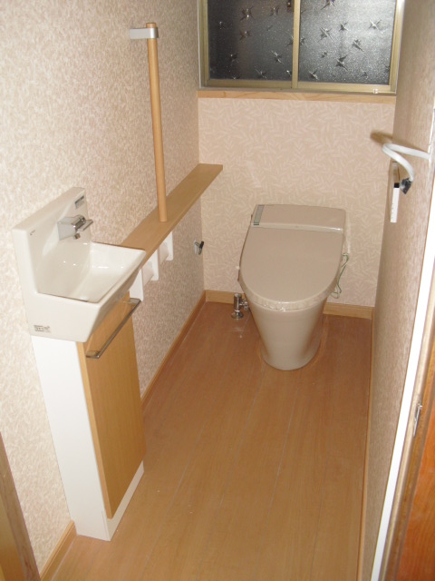 【AFTER】 トイレもやさしいピンク色をメインに・・・。 木目カラーともよく合い、とても落ち着きそうですね!