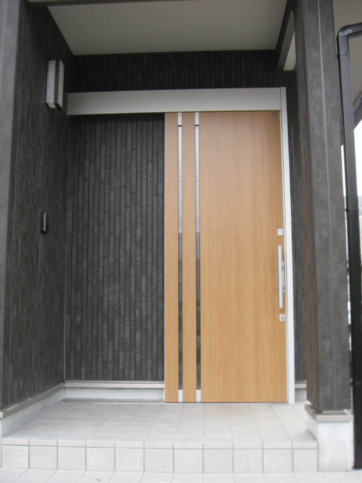 【玄関】 外壁が煙墨(えんぼく)カラーなので、木目調のスライド式のドアが引きたっています。