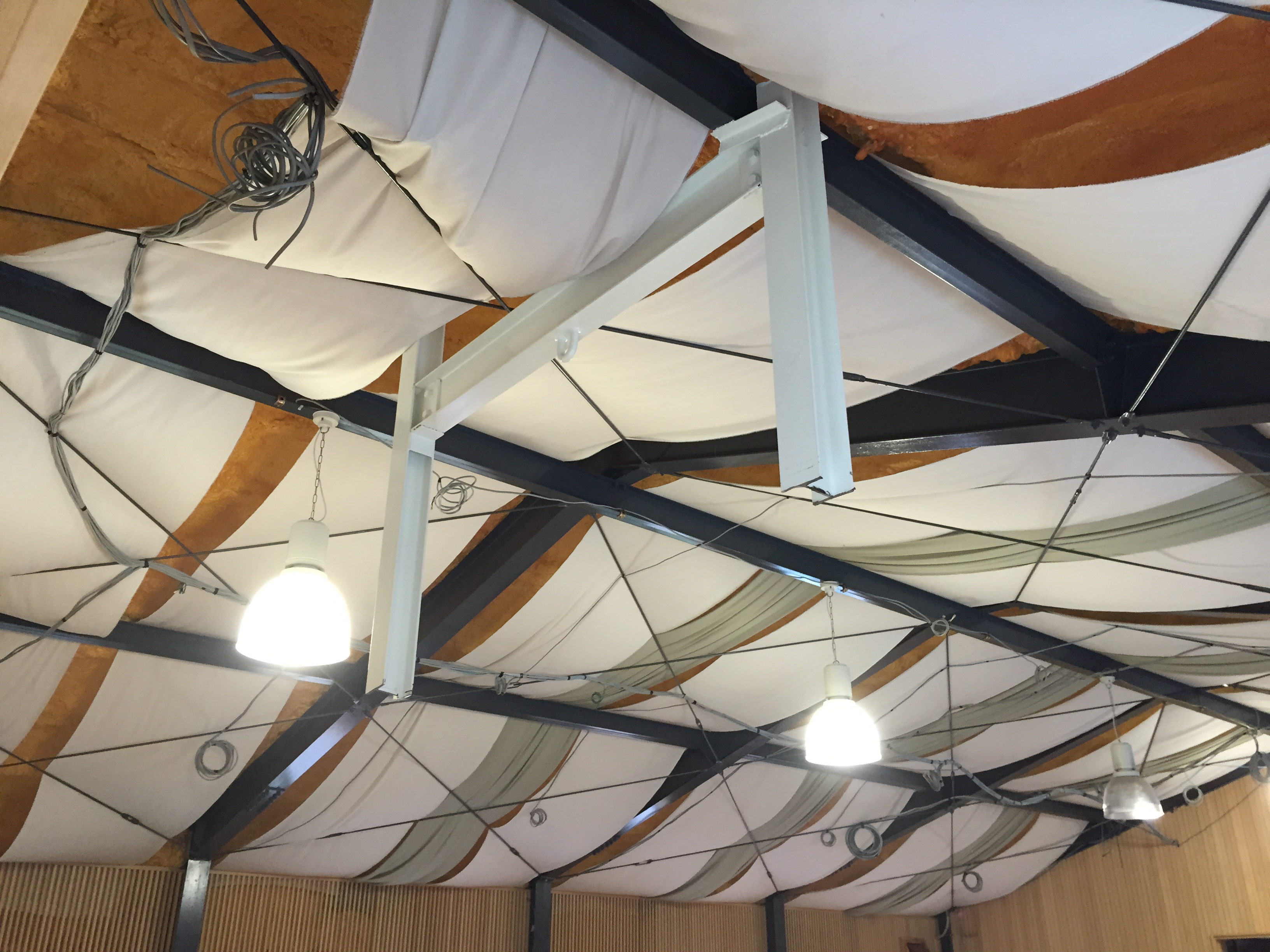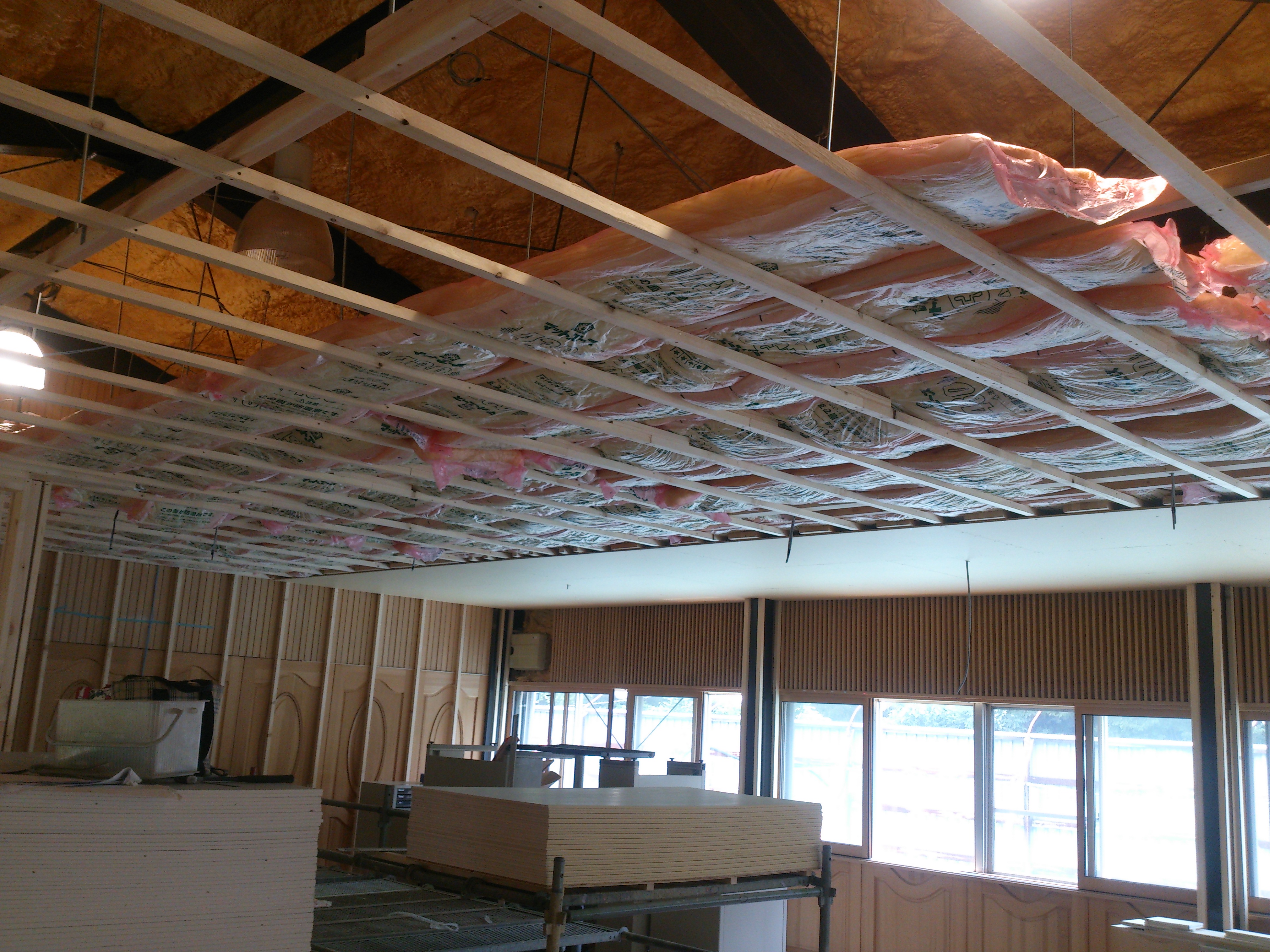 天井の下地を組んで、断熱材を入れて、ボードを貼っていきます。