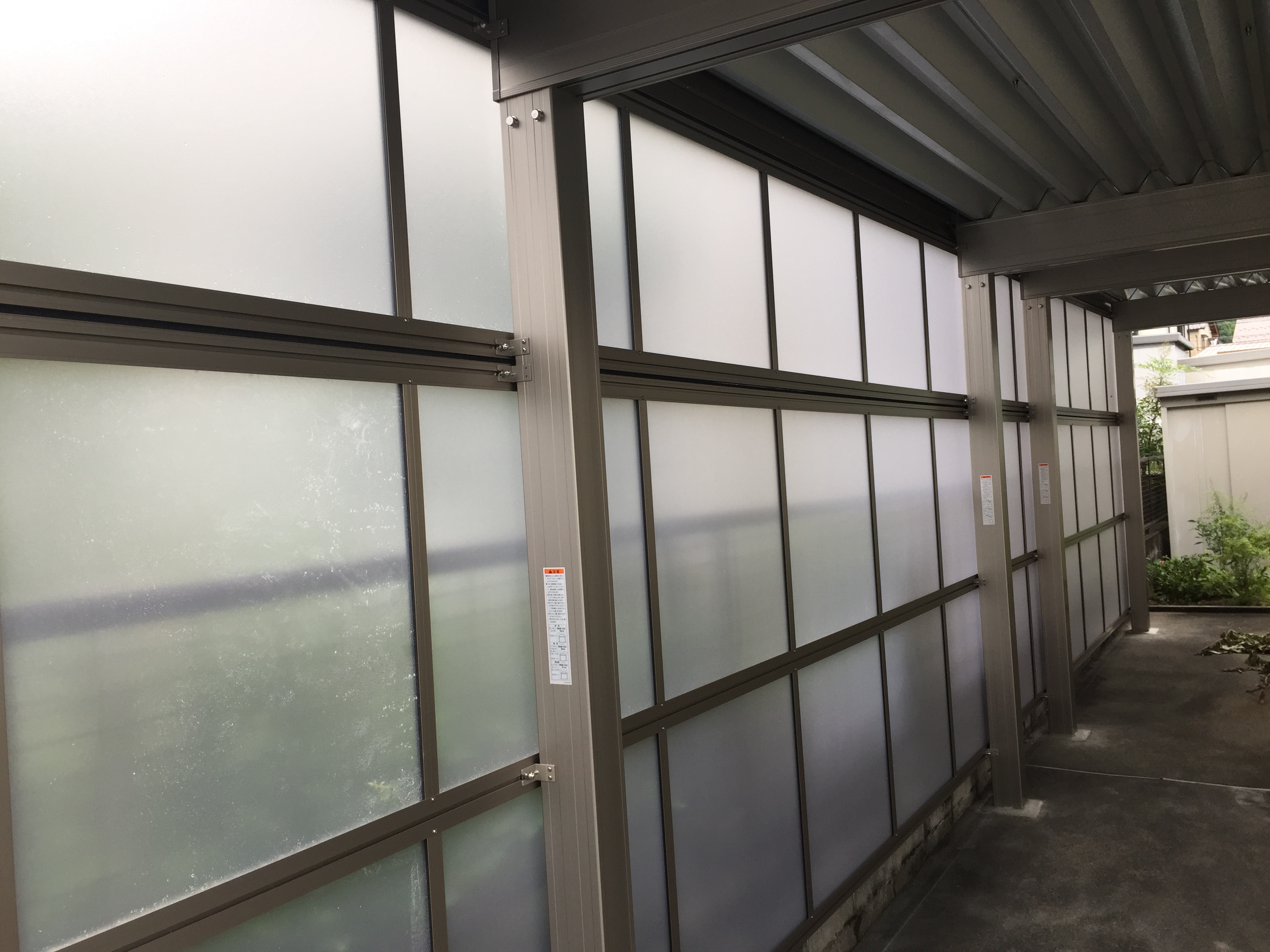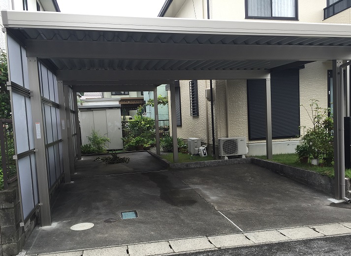 雪に強い折版屋根のカーポート。 側面パネルも取り付けたので、防風効果や目隠し効果があります。