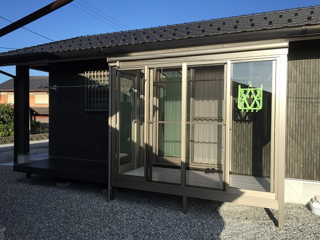 もともとのウッドデッキを移設して、窓部分にはサンルームを新たに設置しました。 室内の延長としてのサンルーム。 外の天気を気にせずに洗濯物を干せます。