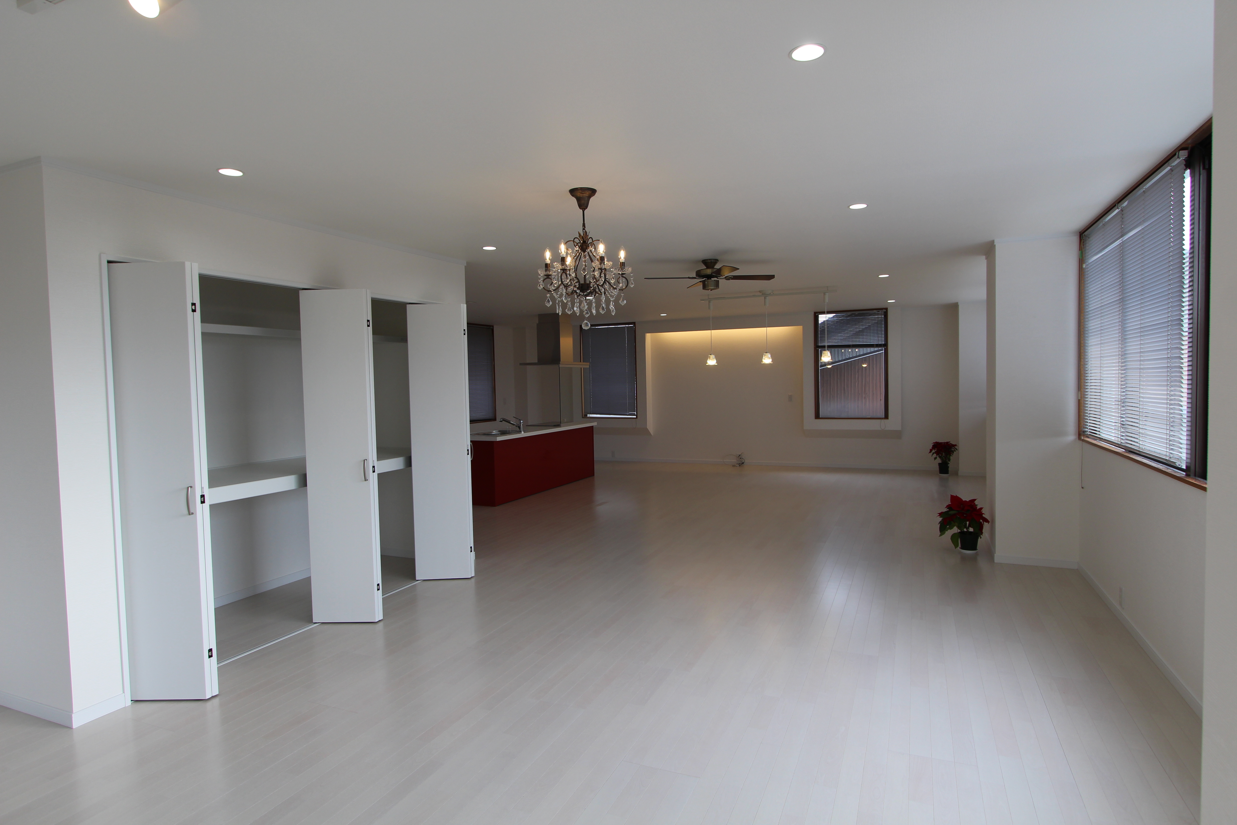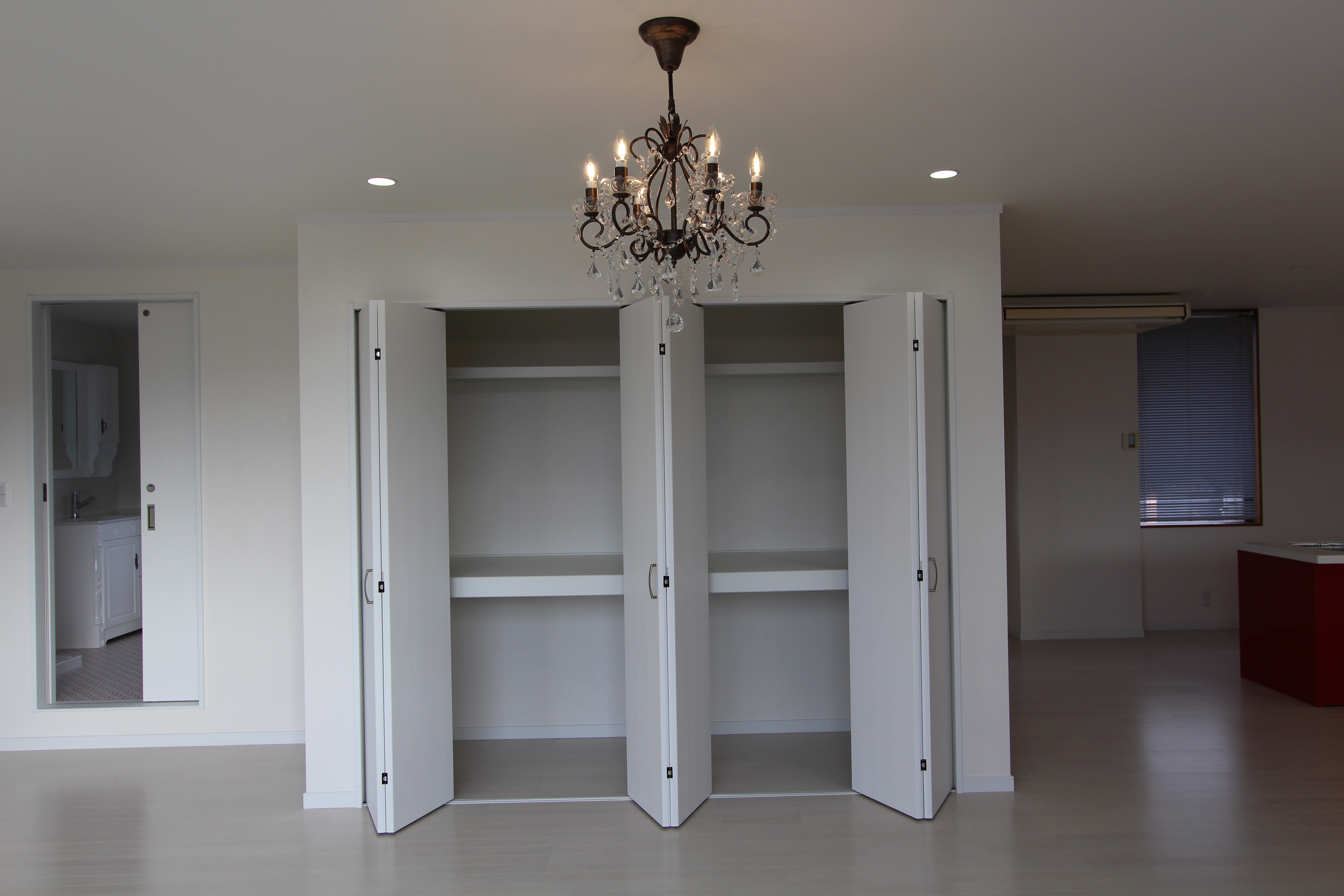 家族が集まるリビングダイニングは、物が多くなりがちです。 大きなクローゼットを設けたので、スッキリとした空間を保つことが出来ます。