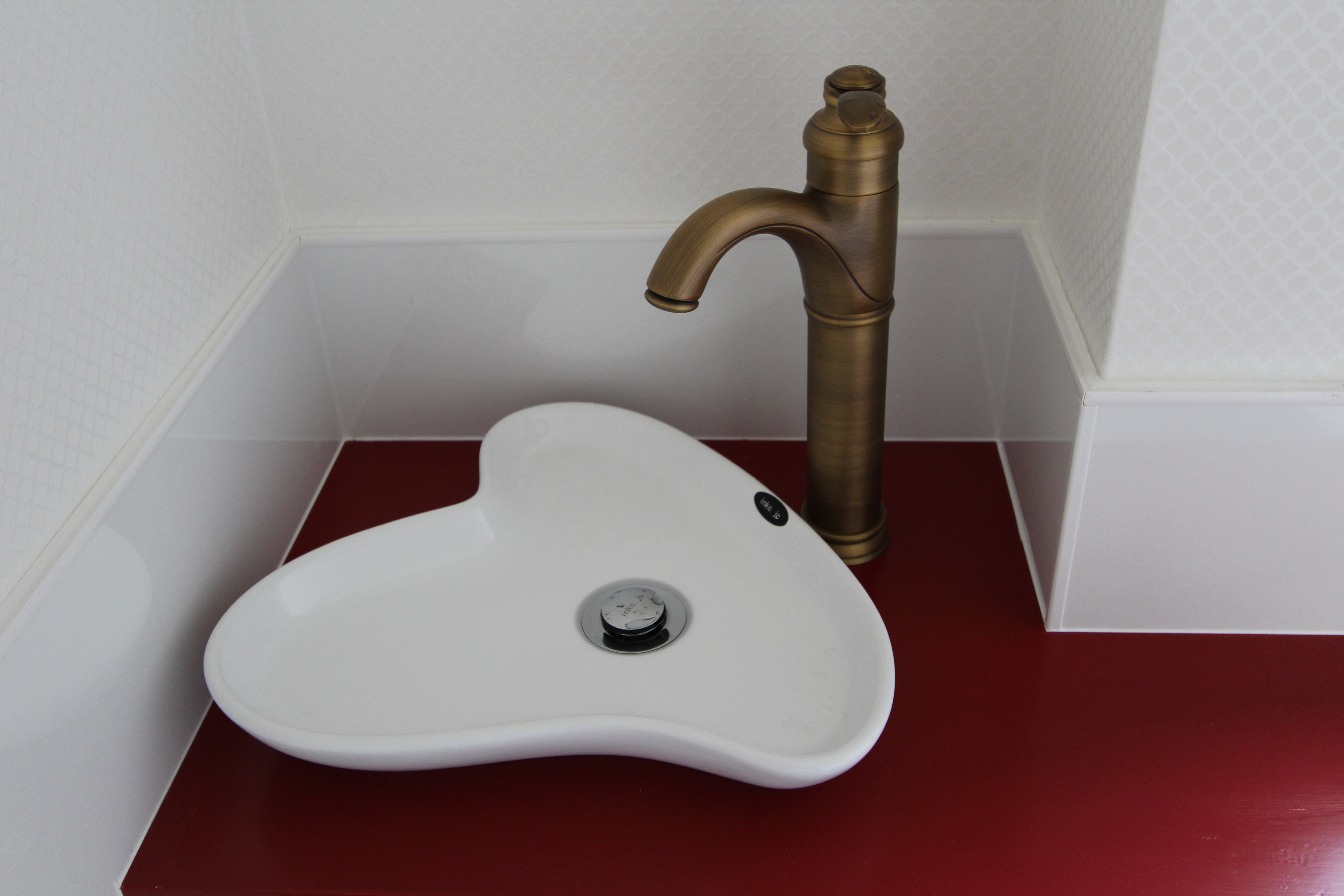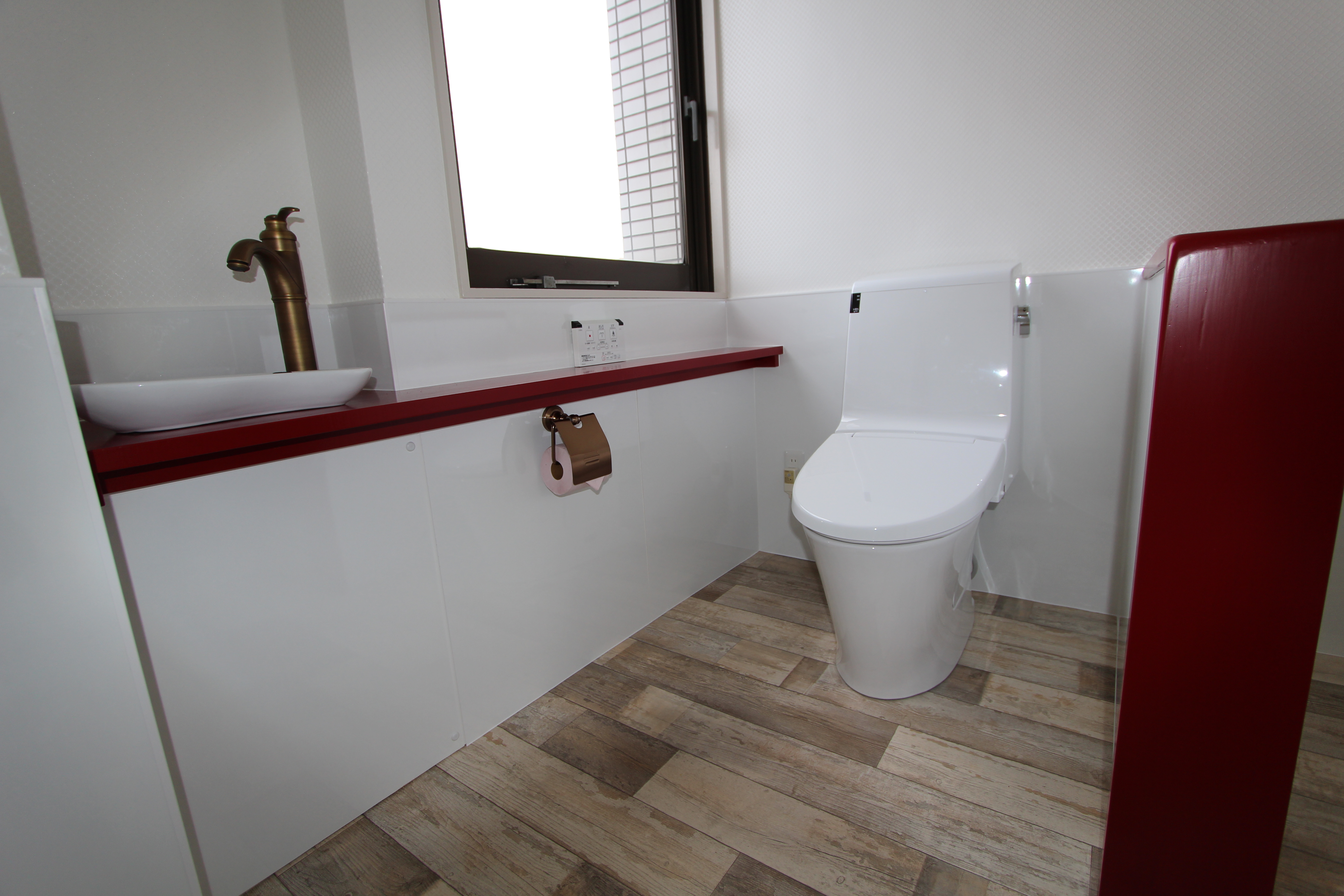 赤色がアクセントのトイレ空間です。 ナチュラルな床材からも暖かみを感じられます。