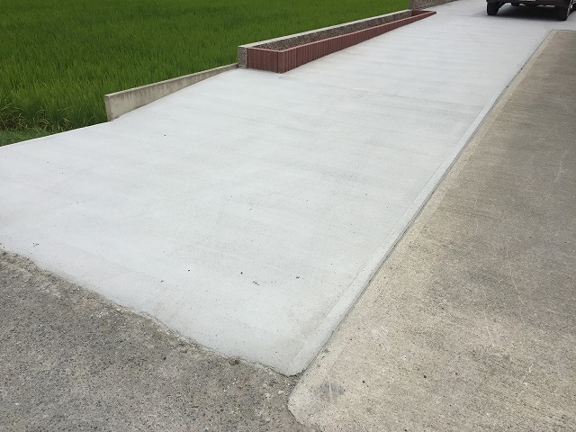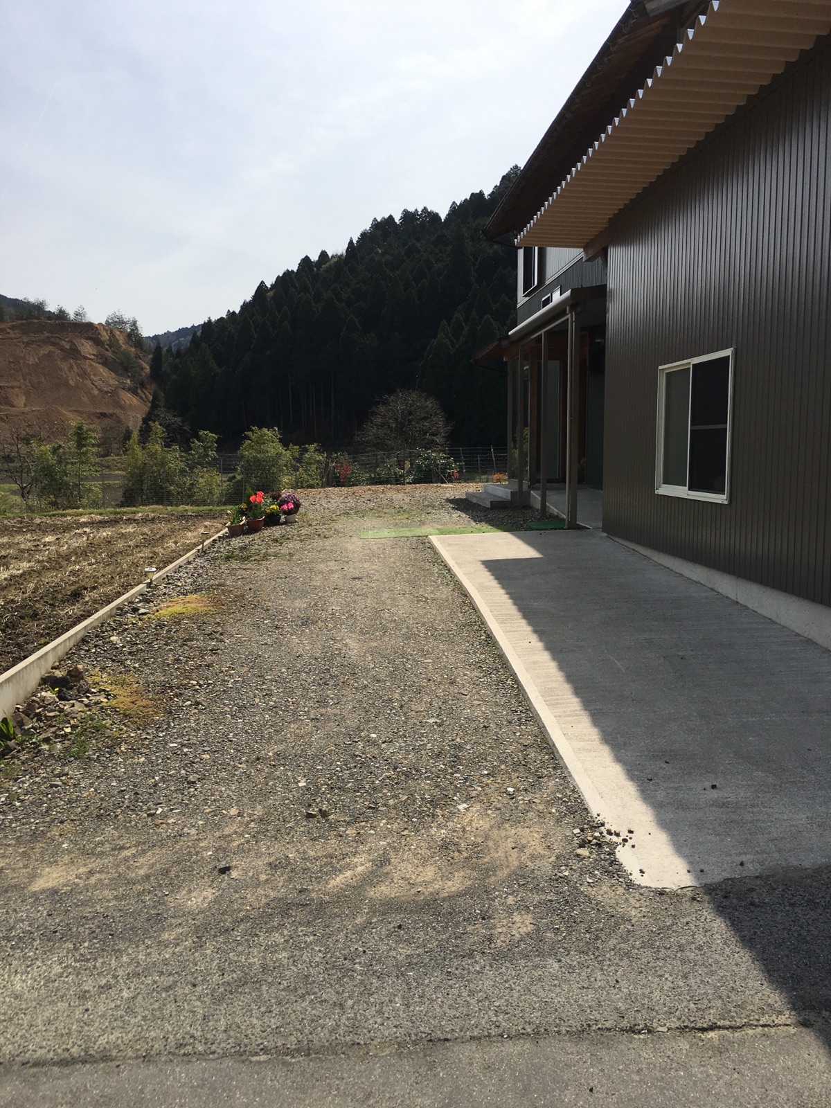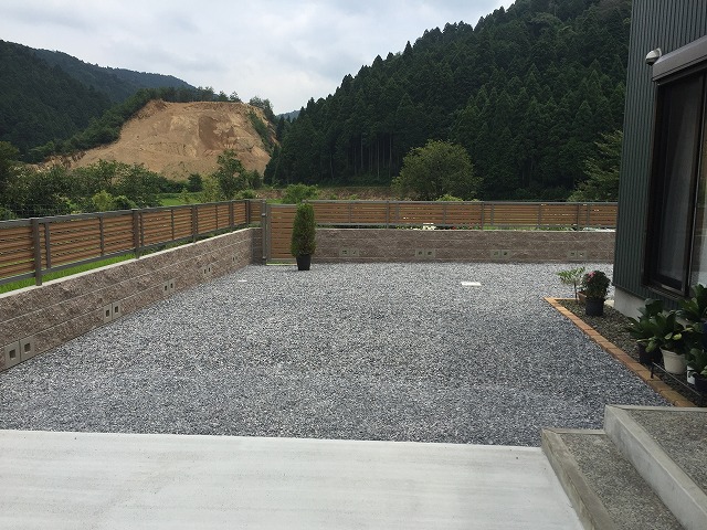 車を停めるスペースには土間コンクリートを敷き、奥の庭スペースには砂利を敷き詰めました。