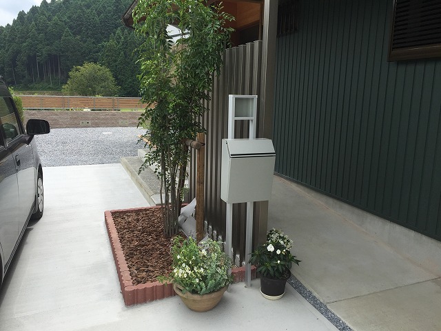 目隠しとおしゃれを兼ね備えた格子を設置し、花壇をつくり、シンボルツリーを植えました。 新しいポストも設置しました。 玄関先に素敵な空間が出来ましたね。