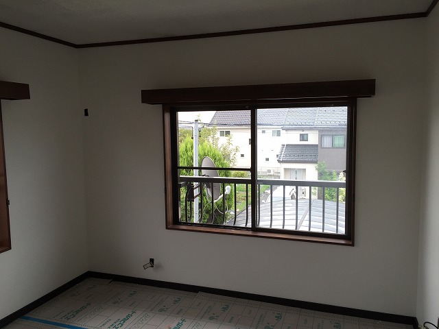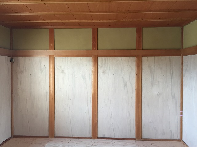 和室の壁をクロスにする為、塗り壁の上に薄いベニヤを張ります。