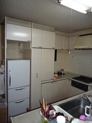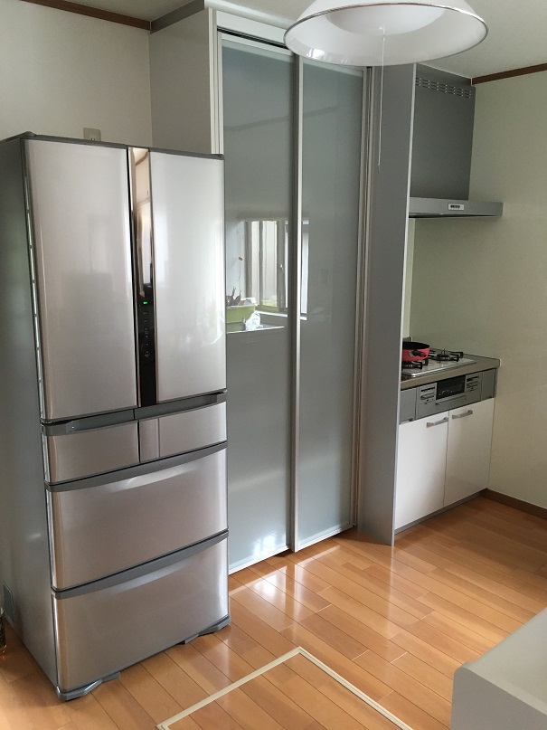 コンロの横には収納量の多い食器棚を設置しました。 キッチンのレイアウトを変えたことにより、以前は置けなかった大きめの冷蔵庫が置けるようになりました。