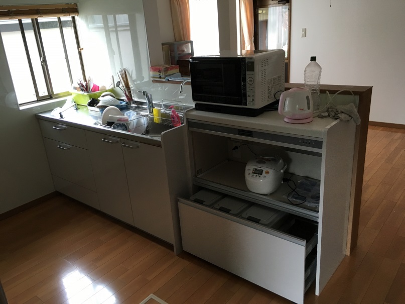 以前はL型のキッチンでしたが、今回は二列型にレイアウトを変えました。 キッチンのシンクの横には、電子レンジや炊飯器が置ける収納棚も併設しました。 引き出しの中にはゴミ箱が収まるので、見た目もスッキリです。