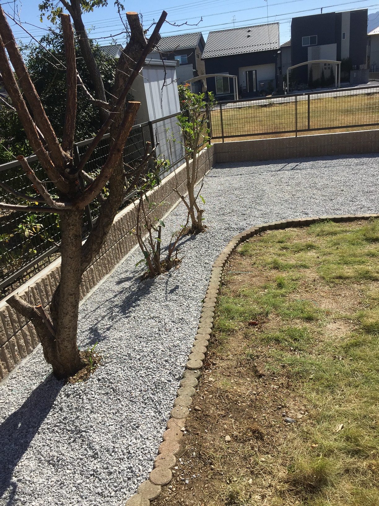 以前のお庭は、雑草が生えてしまいお手入れが大変だったそうです。 今回、残しておきたい植栽だけ残し、他の部分は防草シートと砂利を敷き、雑草をガードしました。