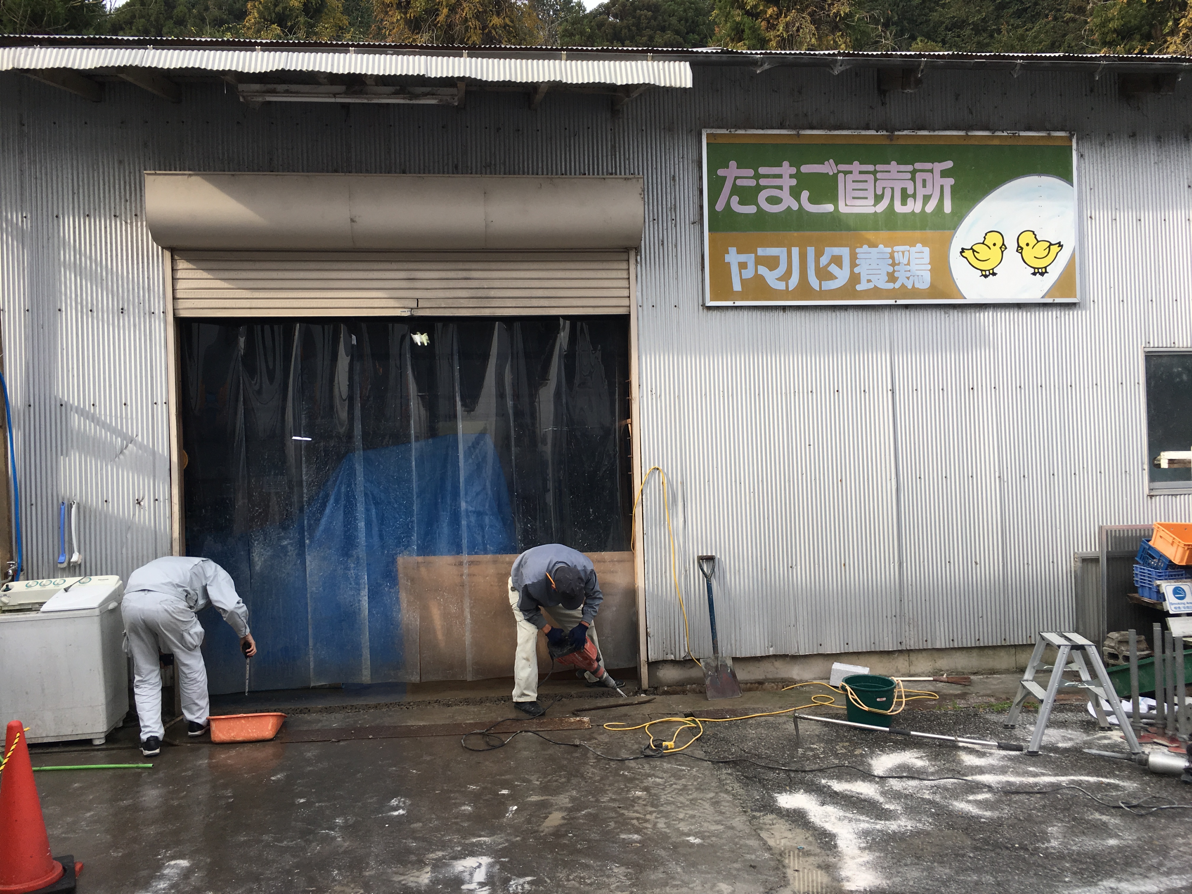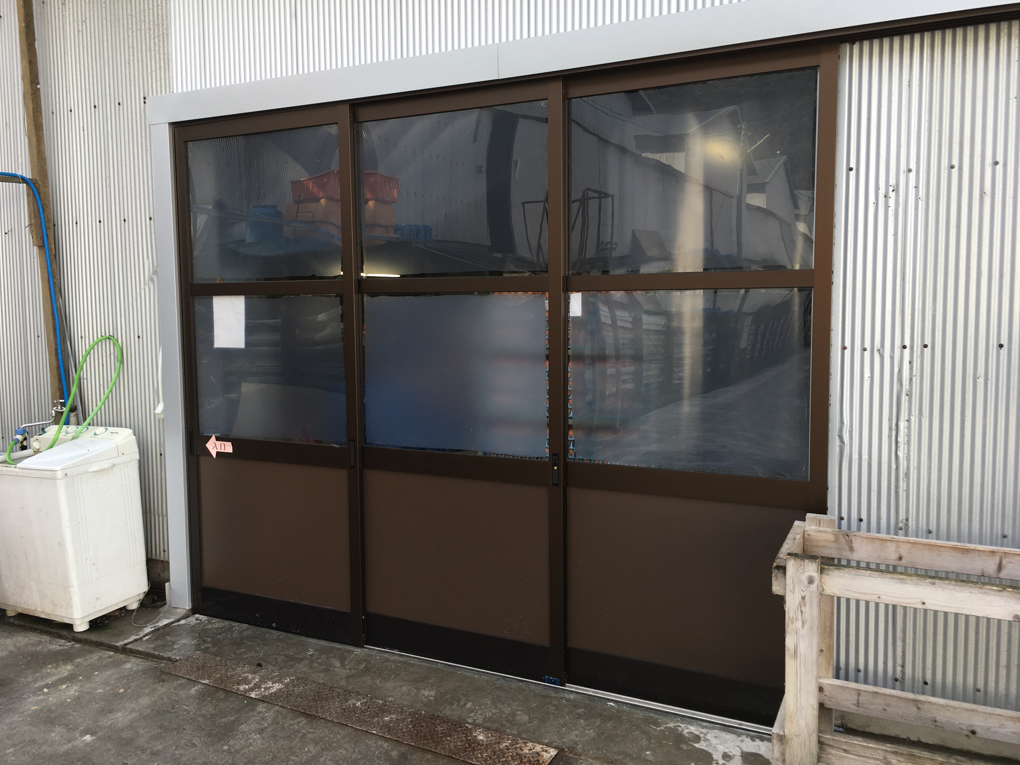 いつもイベントでお配りする卵でお世話になっている、ヤマハタ養鶏様の工事です。 販売所の入り口をサッシにしたいとのご依頼を頂きました。 元々はシャッターが取付けしてありましたのでそれを一度外します。 土間を削ってレールを埋込み、枠を作っていきます。 開け閉めしやすいですし、ガラスではなくポリカパネルを使用していますので、割れる心配は必要ありません。 特に冬場は風が入らなくなり、暖かさを感じて頂いています。