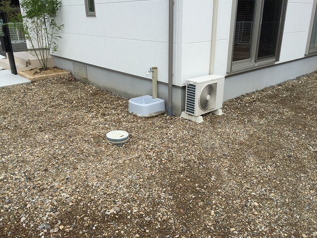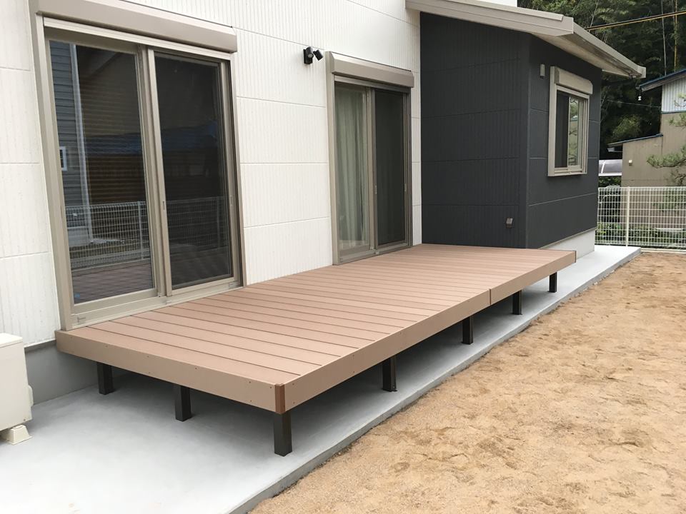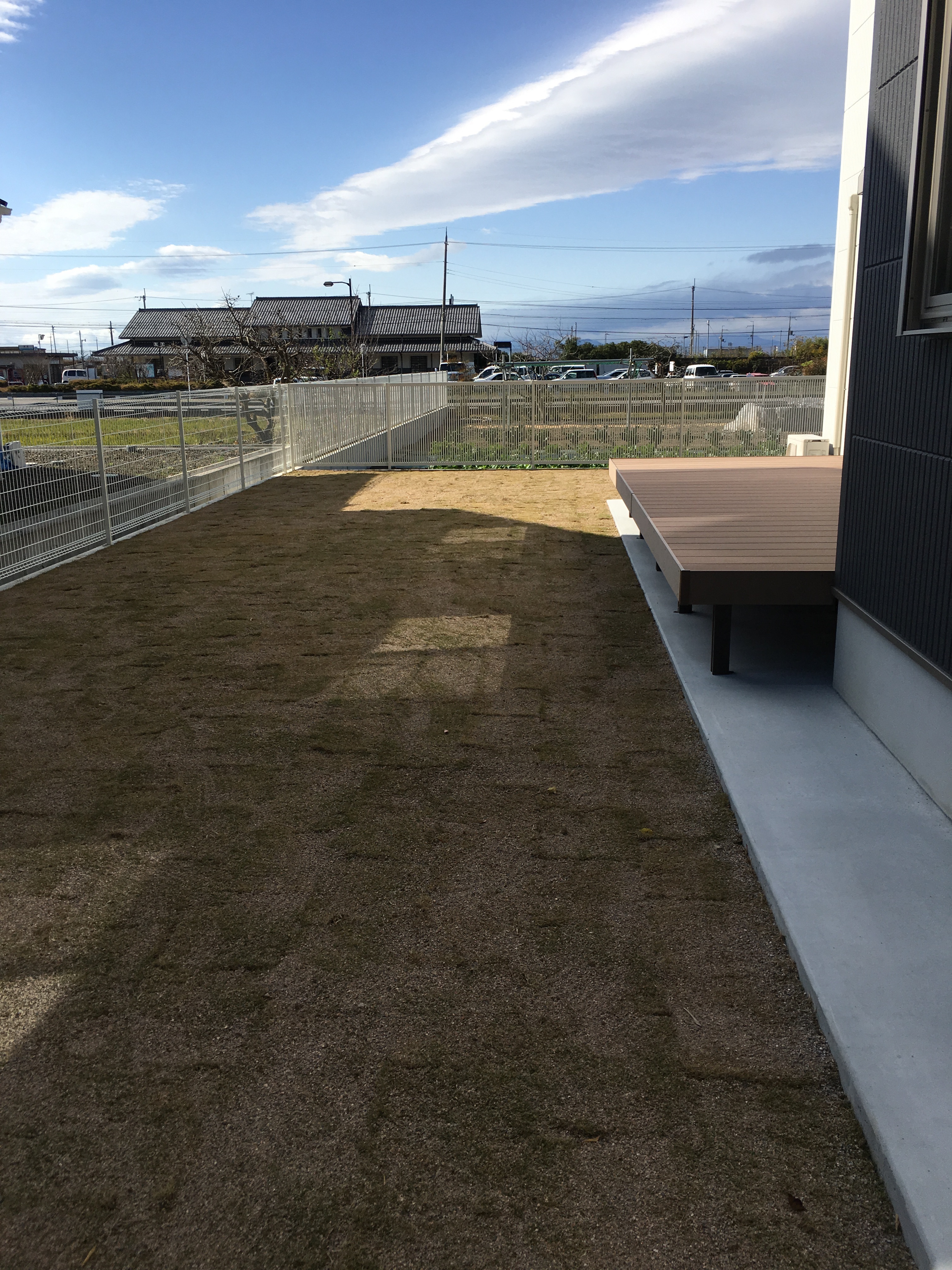 家のまわりに土間コンクリートを打ち、ウッドデッキを設置しました。 ウッドデッキは、腐りにくい樹脂製です。木目調で温かみを感じられます。 敷地全体には、芝を敷き詰めました。