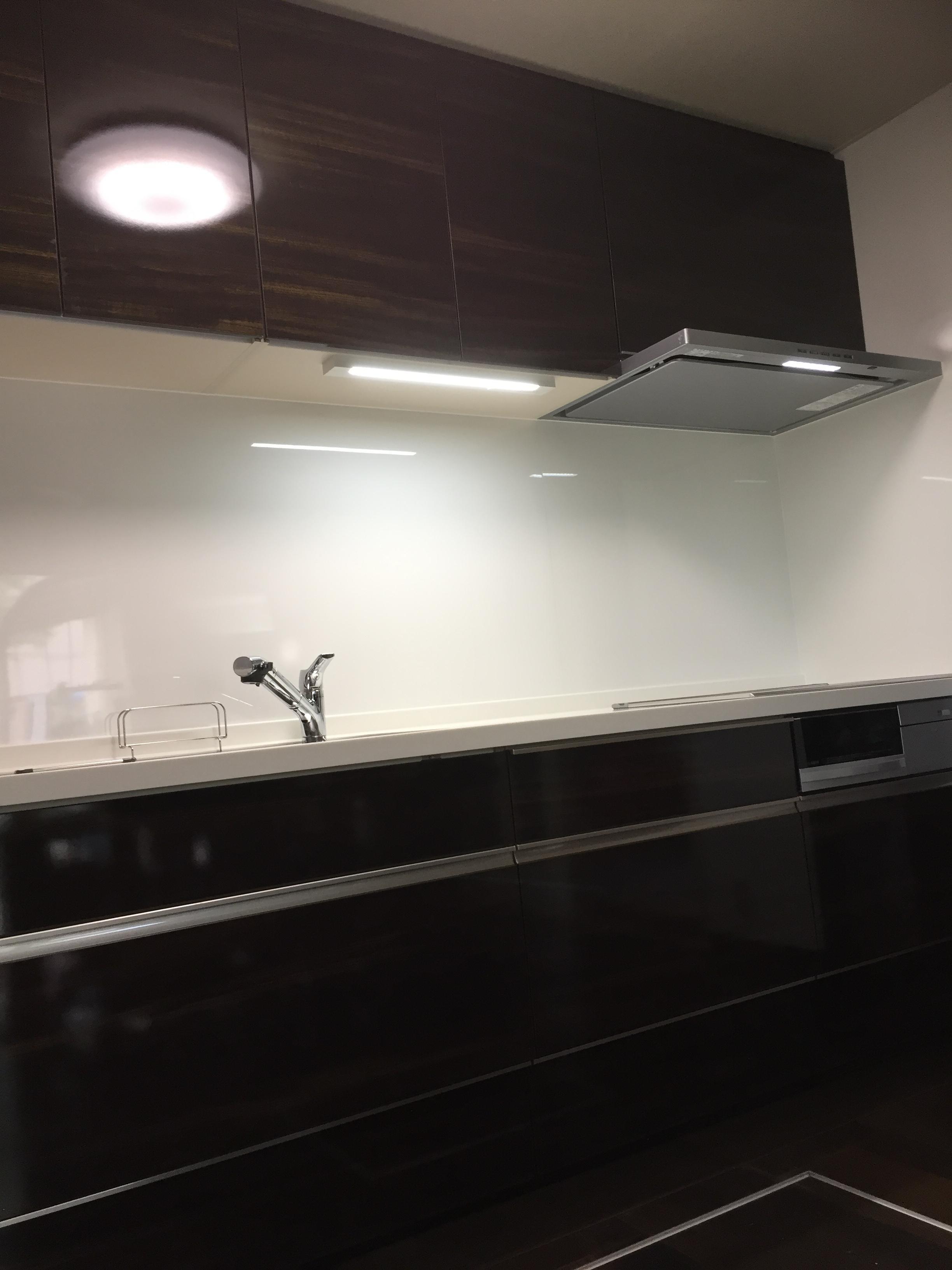 天井の電球がキッチンの扉に映るくらい、ピカピカの鏡面仕上げのキッチンです。光の当たり具合で、色々な表情を見せてくれます。