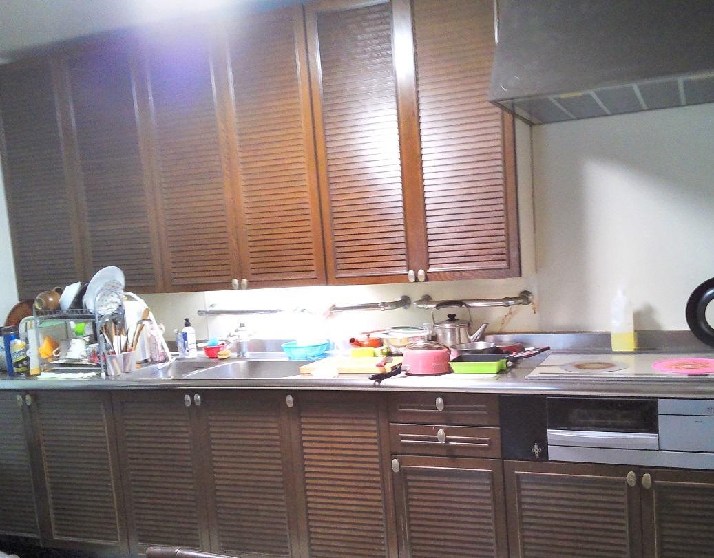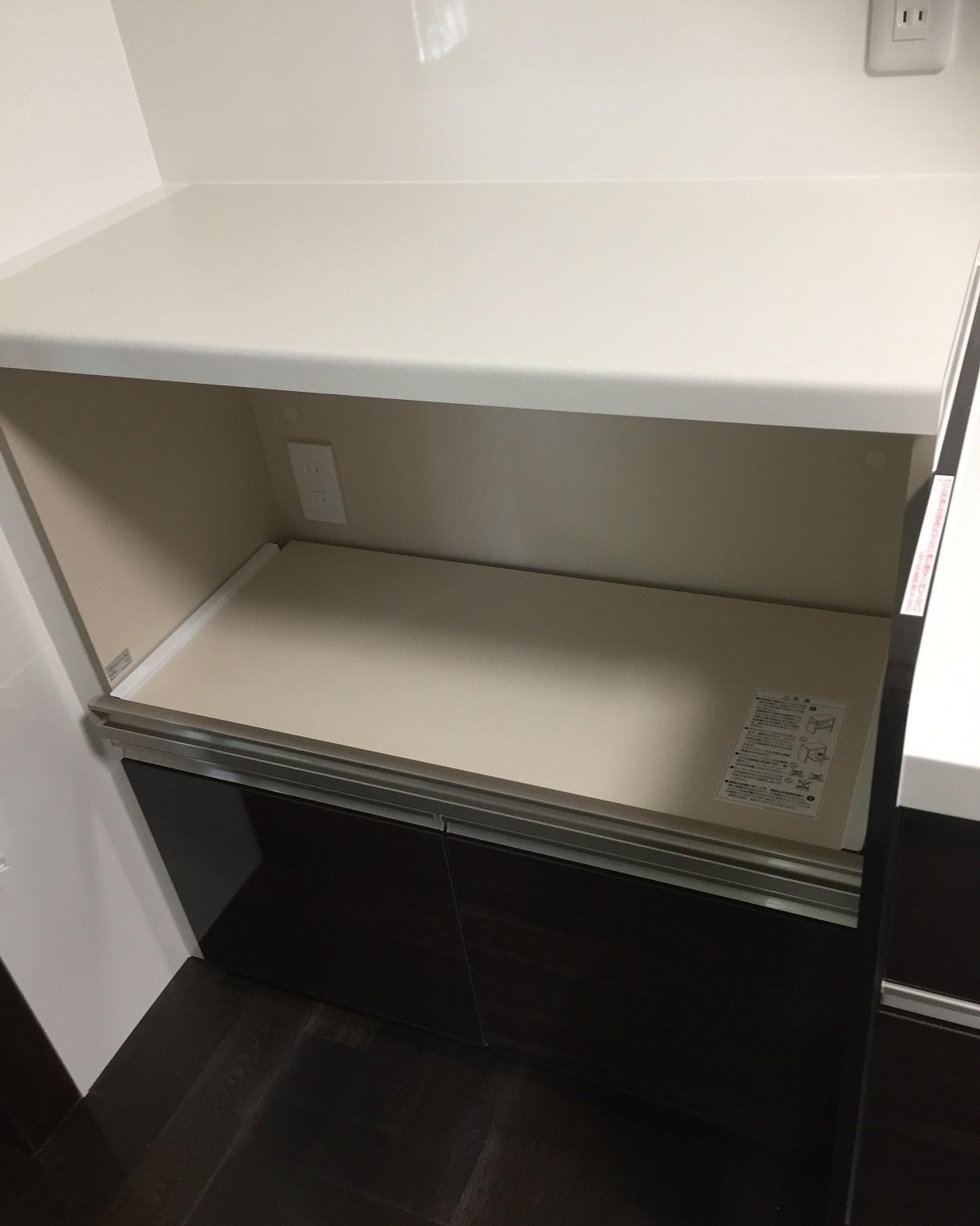 以前のキッチンは、作業スペースが広い分、色々と物を置いてしまいがちでした。今回のリフォームで、キッチンとは別に、家電製品を置く専用の収納棚を設けました。