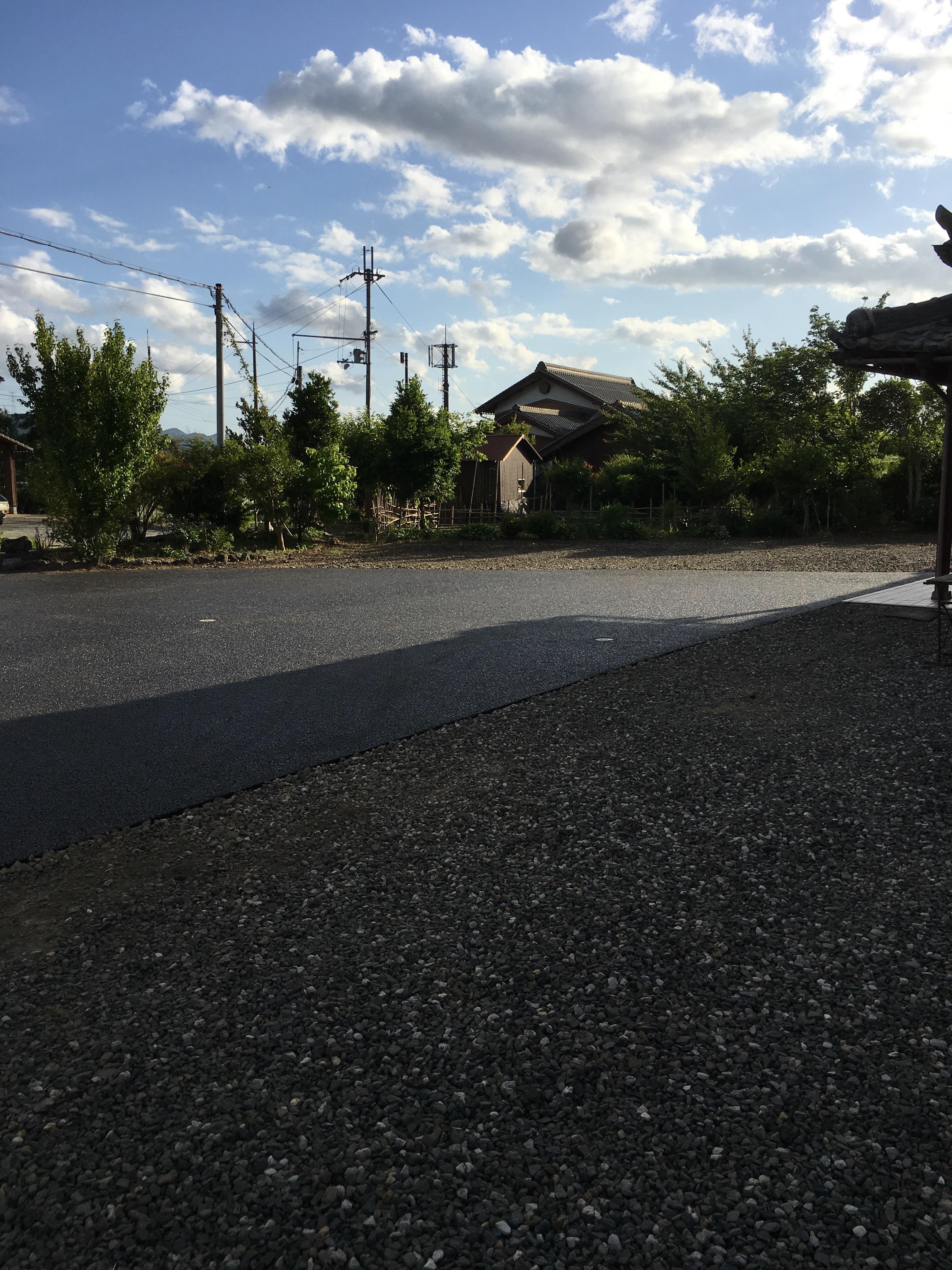 もともとは、敷地内に砂利が敷いてありました。雨で砂利が道路へ流れ、どんどん減っていってしまうのがお悩みでした。そこで今回、舗装工事を施しました。透水性の舗装なので、水が溜まりにくくなっています。工事も1日で完了し、夕方には車が通ることができます。
