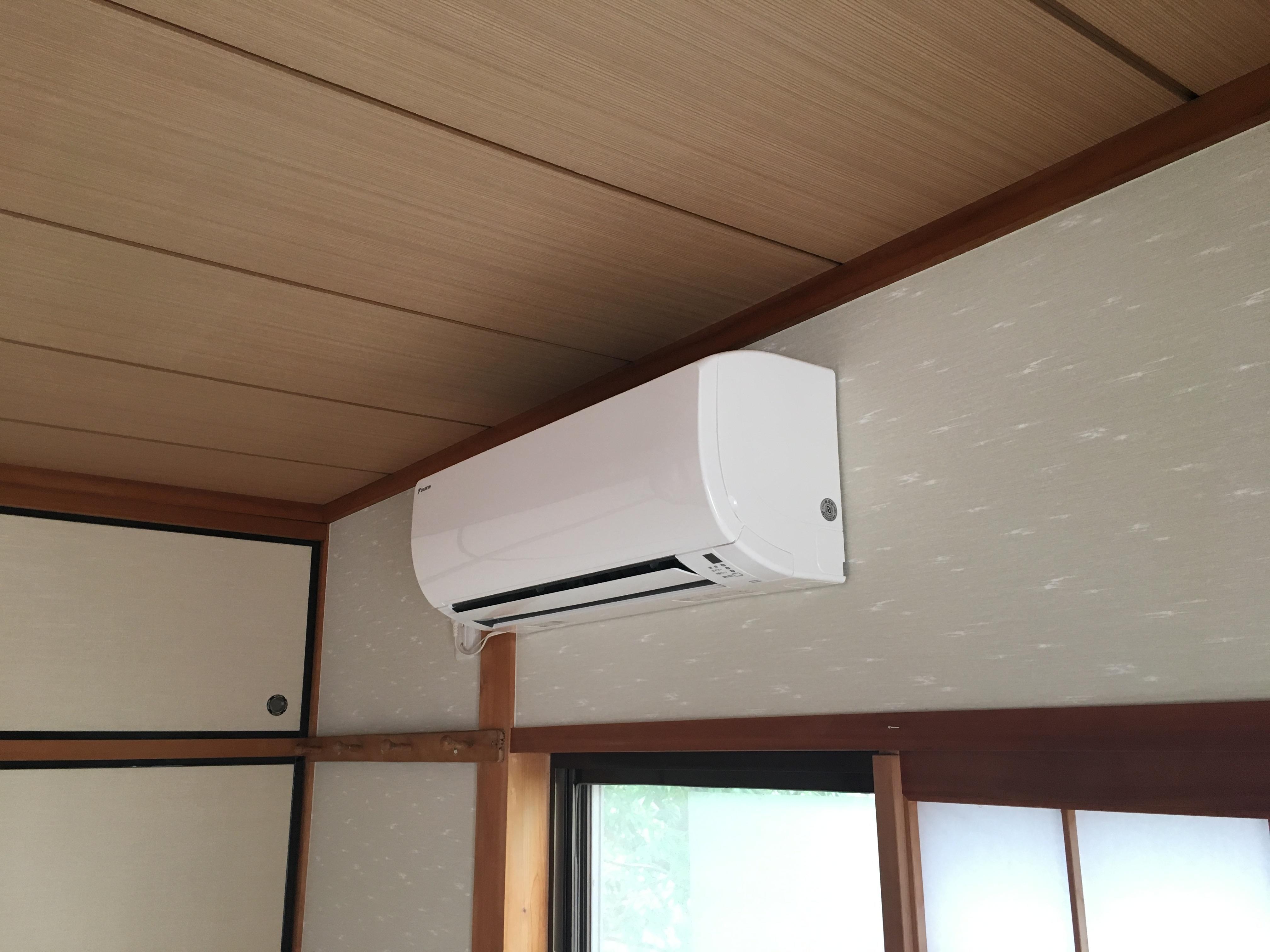 壁には、下地を入れクロスを貼りました。エアコンはダイキン製のニューモデルを設置しました。壁を抜いた部分には、建具を入れました。ご主人様には新しい空間で暑い夏を快適に過ごして頂きたいです。