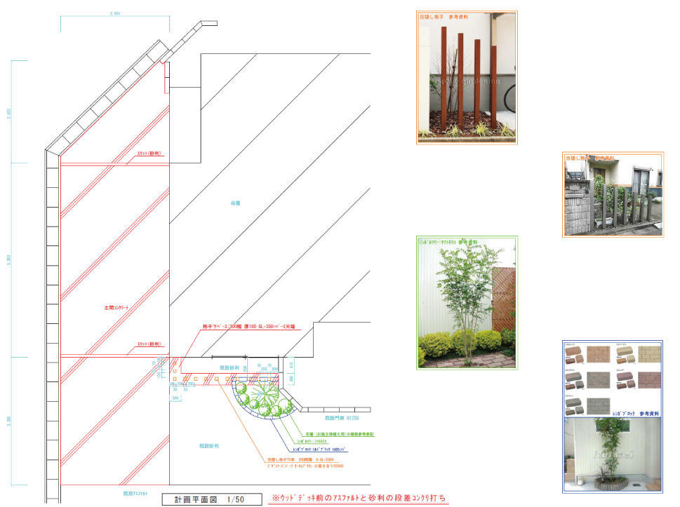 玄関まわりには、目隠しの為、お洒落な格子を立てました。レンガブロックで仕切った部分には、シマトネリコなどの植栽を植えました。