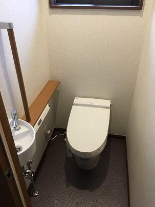 トイレはタンクが無い分、すっきりと広く感じられます。クッションフロアーは、よく見ると花の模様が付いています。手洗い器と手摺りも付いて、実用的なトイレになりました。
