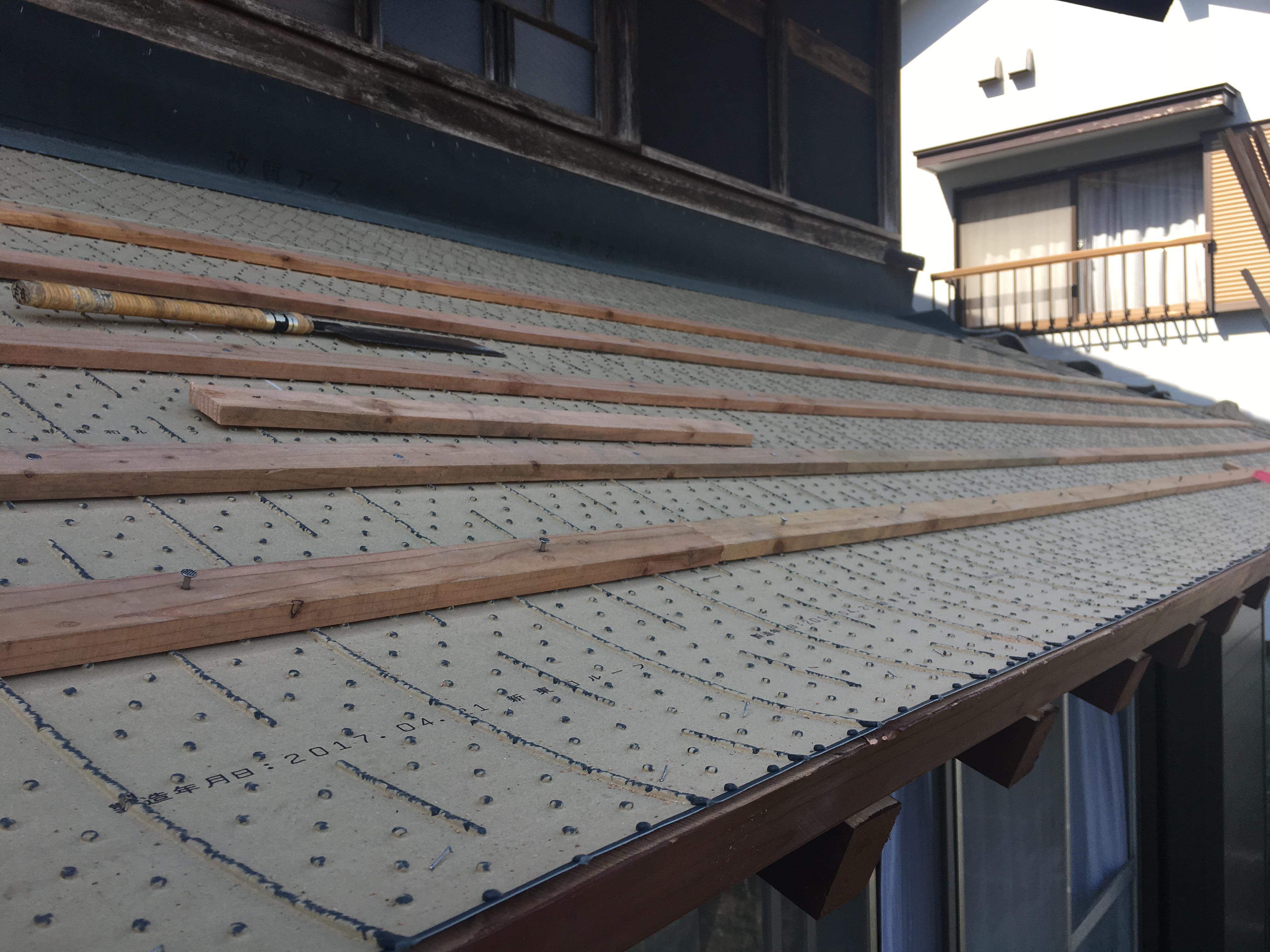 外壁を貼る前に、防水シート(水は防ぐが湿気は通すシート)をしっかり貼ります。