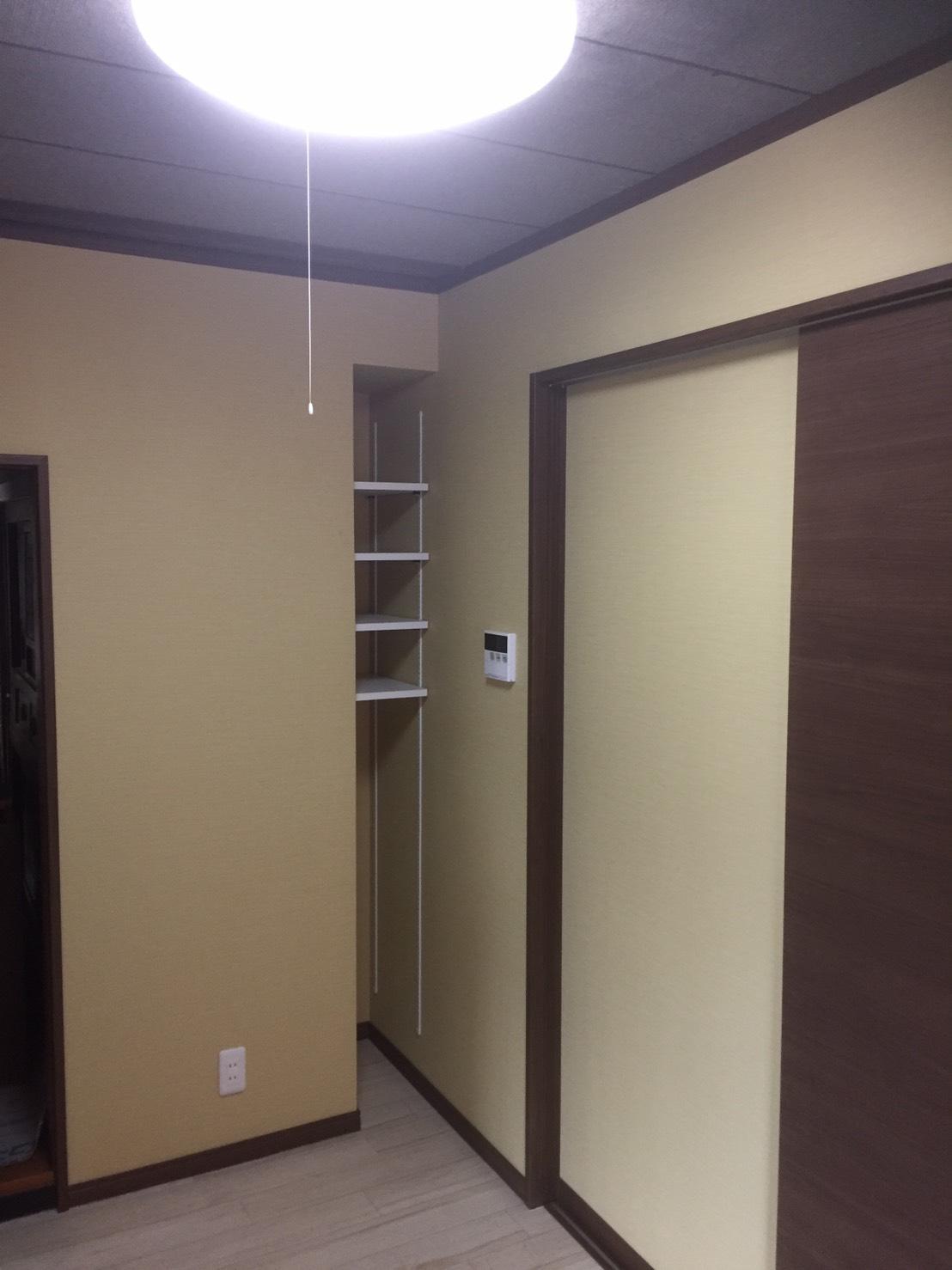 脱衣場の入り口の近くに出来たスペースを利用して、こちらにも可動タイプの棚を設けました。日用品のストックを収納するのもよし、ちょっとした飾り棚にするもよし、多種多様に使えます。