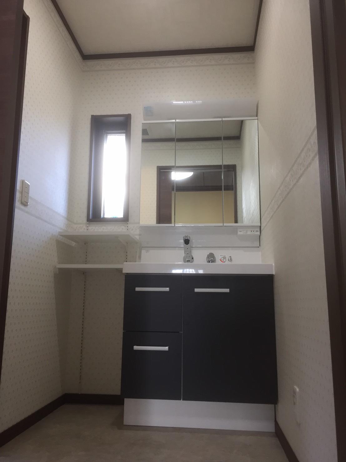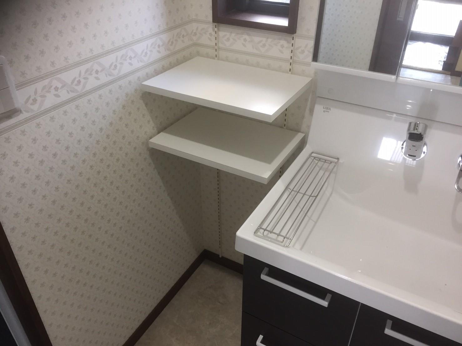 シックな色合いの洗面化粧台の横には、可動タイプの棚板を取付けました。タオルや日用品の置き場に最適です。