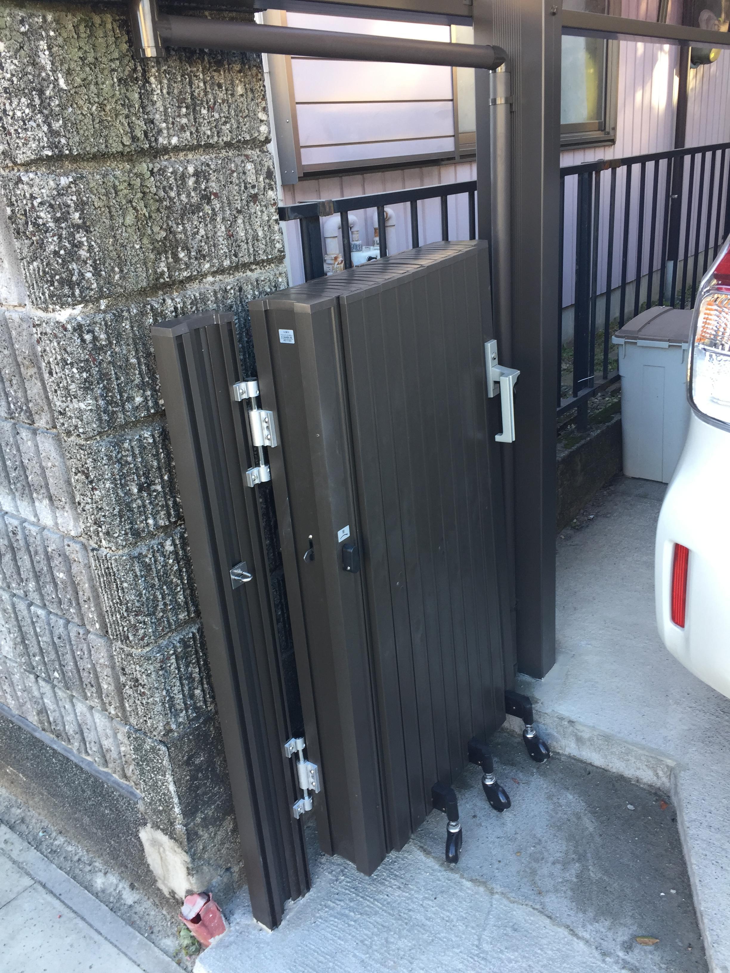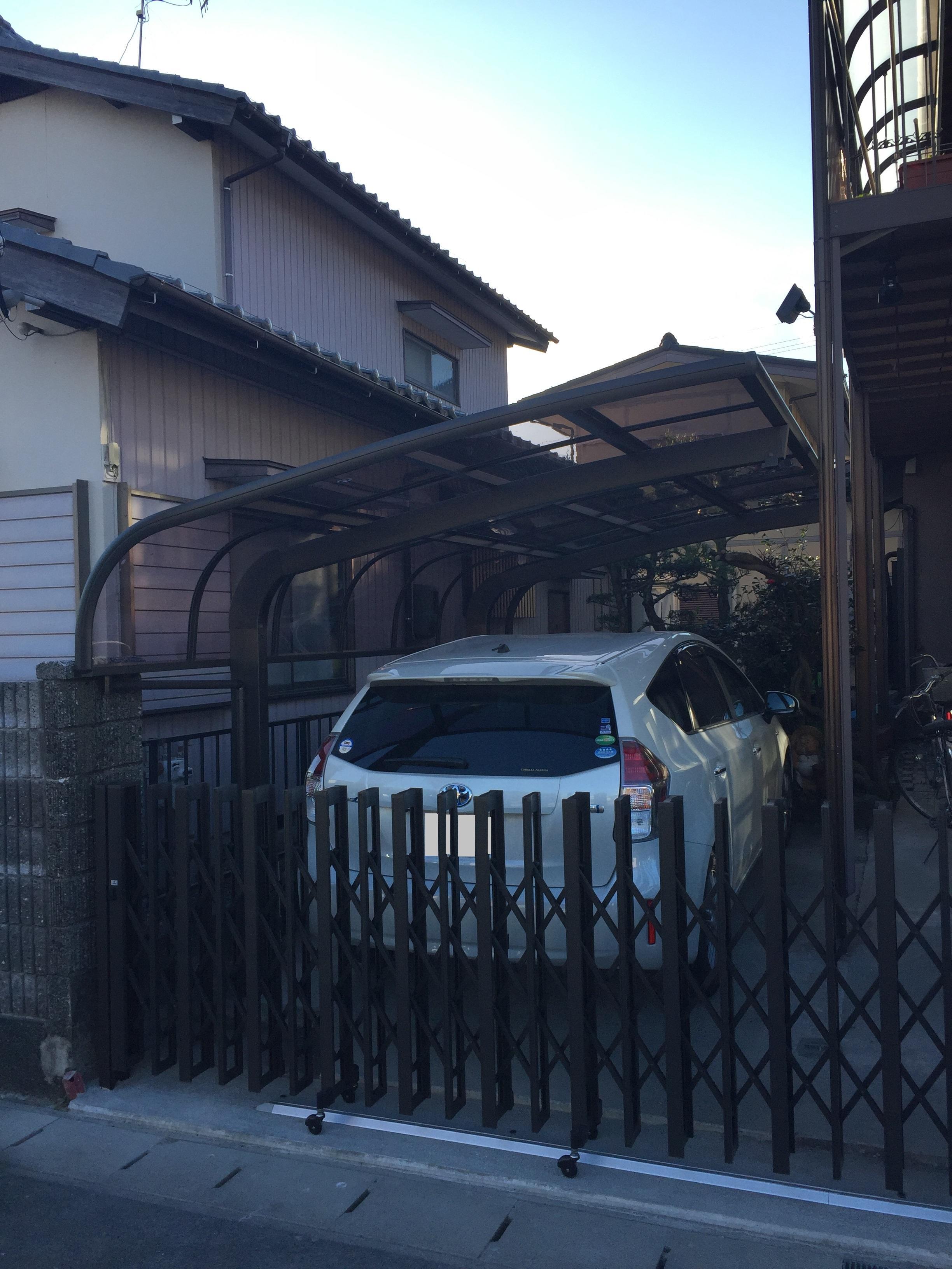 LIXILの「フーゴ」というカーポートをご採用頂きました。新に取り付けた伸縮門扉は、LIXILの「アルシャインⅡ」です。今後、雨風から大事なお車を守ってくれることと思います。