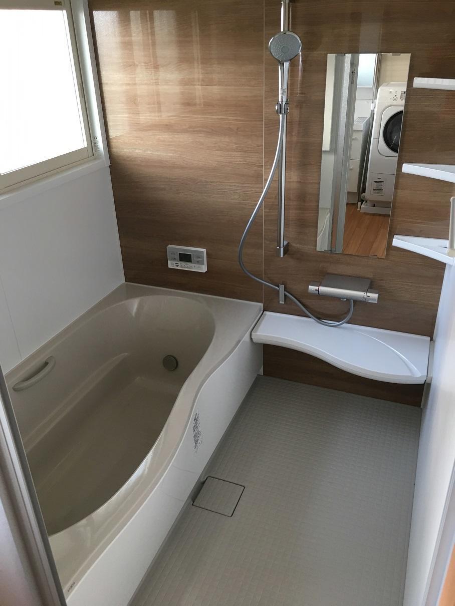 浴室は温かみのある木目調パネルを選んで頂きました。温かみがあるのは見た目だけでなく、実際に浴槽の湯が冷めにくく、洗い場の床もヒンヤリしません。