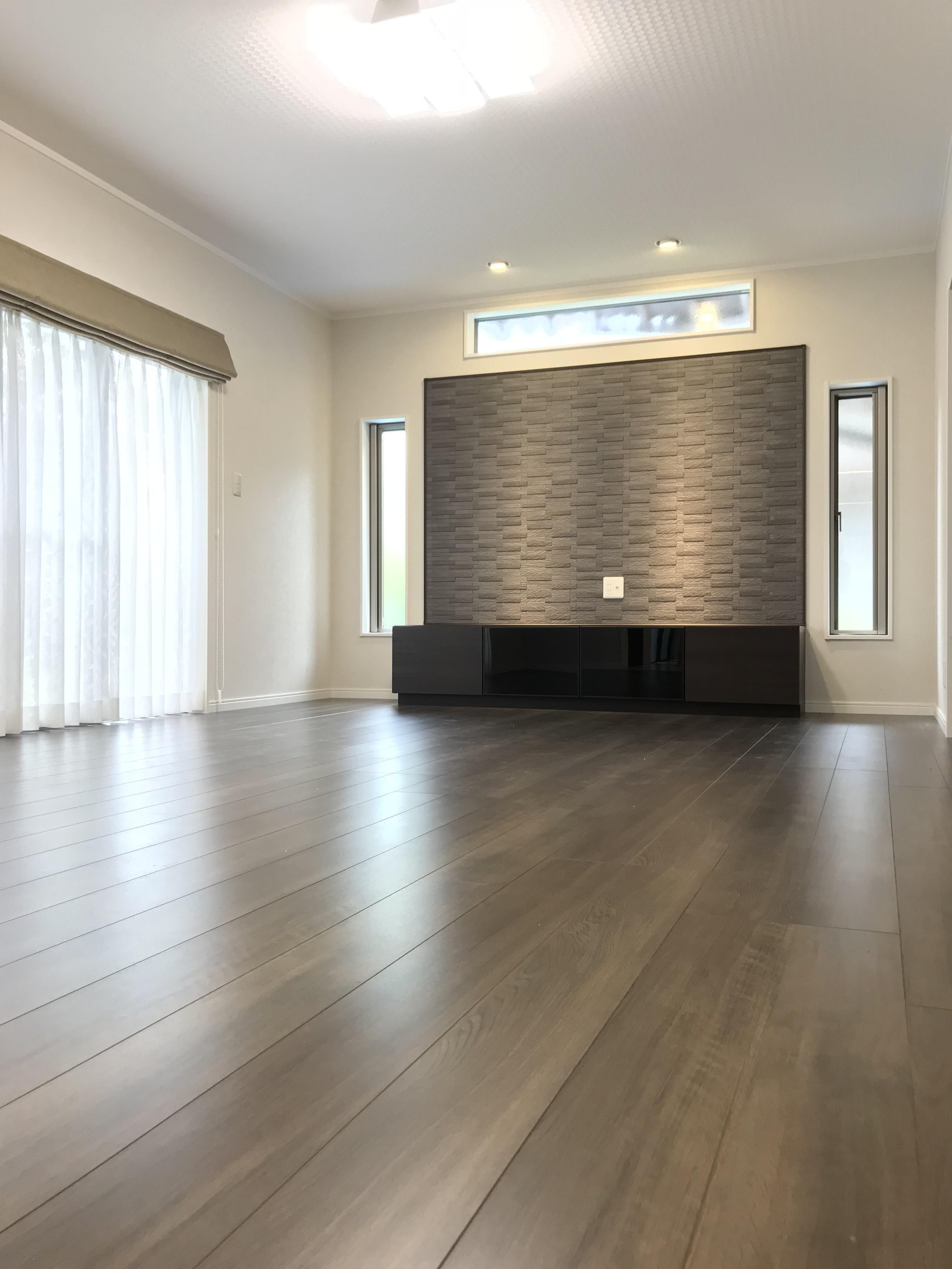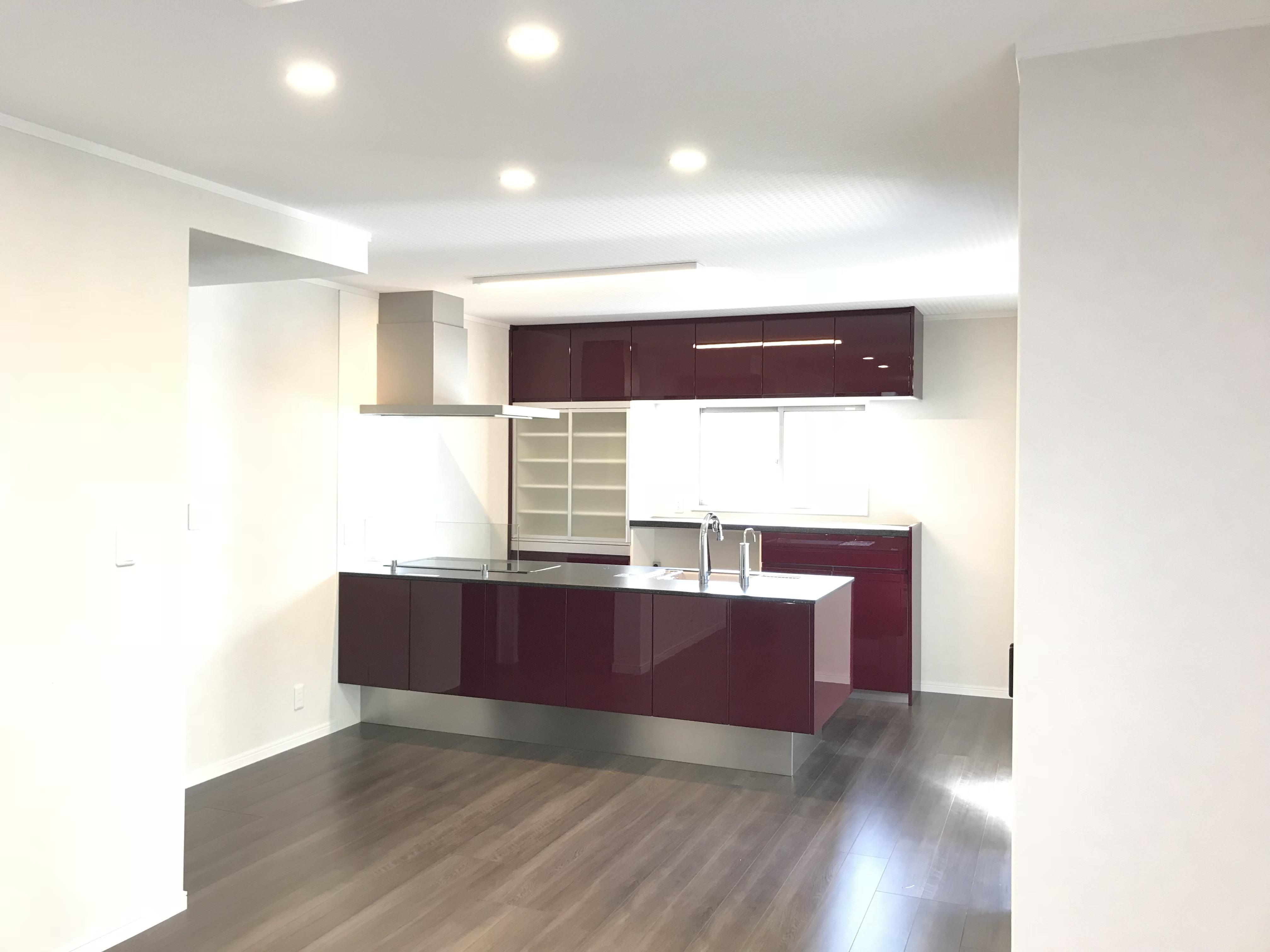 リビングダイニングの主役は、赤い色目の対面キッチンです。扉は鏡面仕上げで高級感のある仕上がりです。