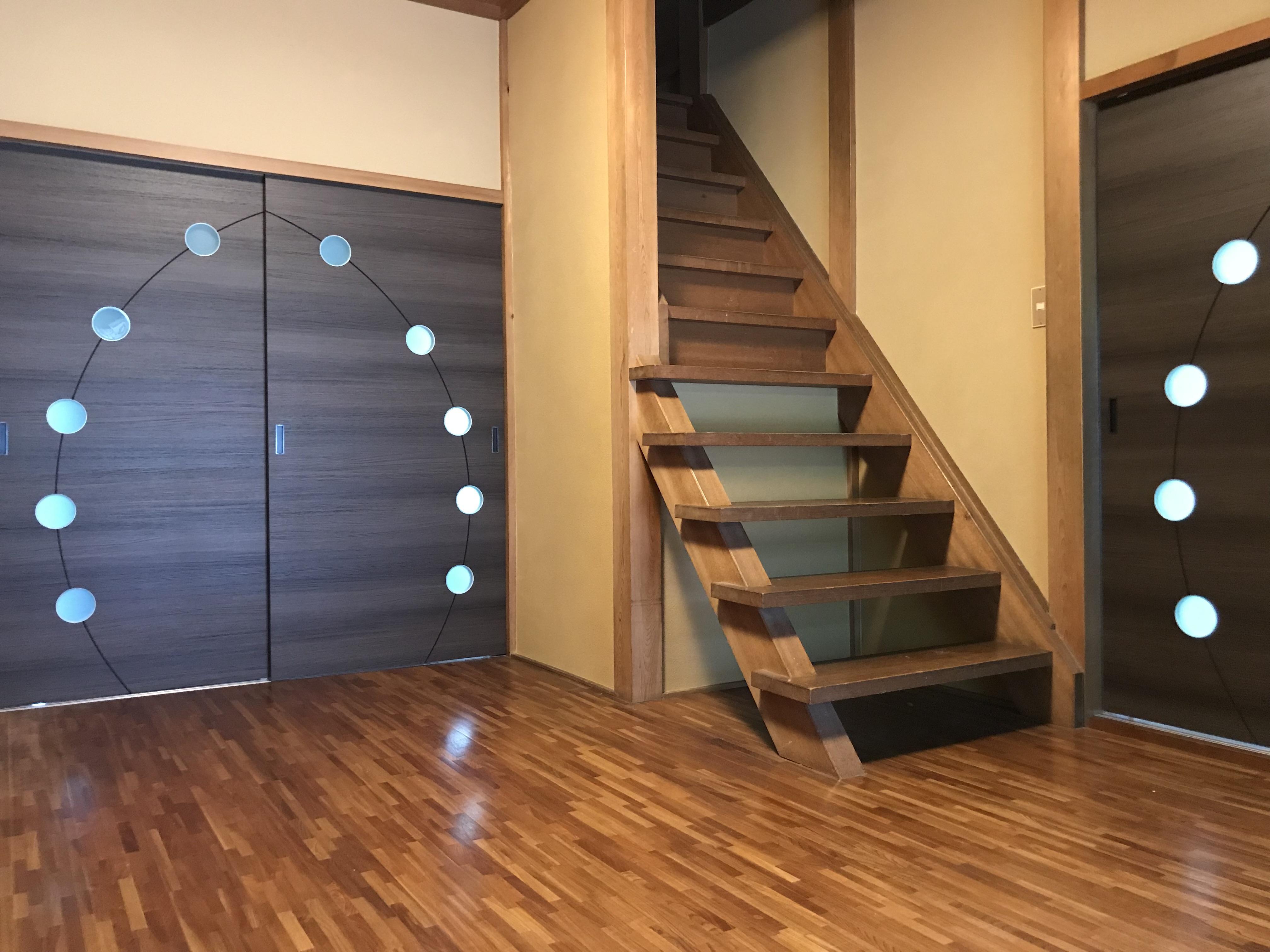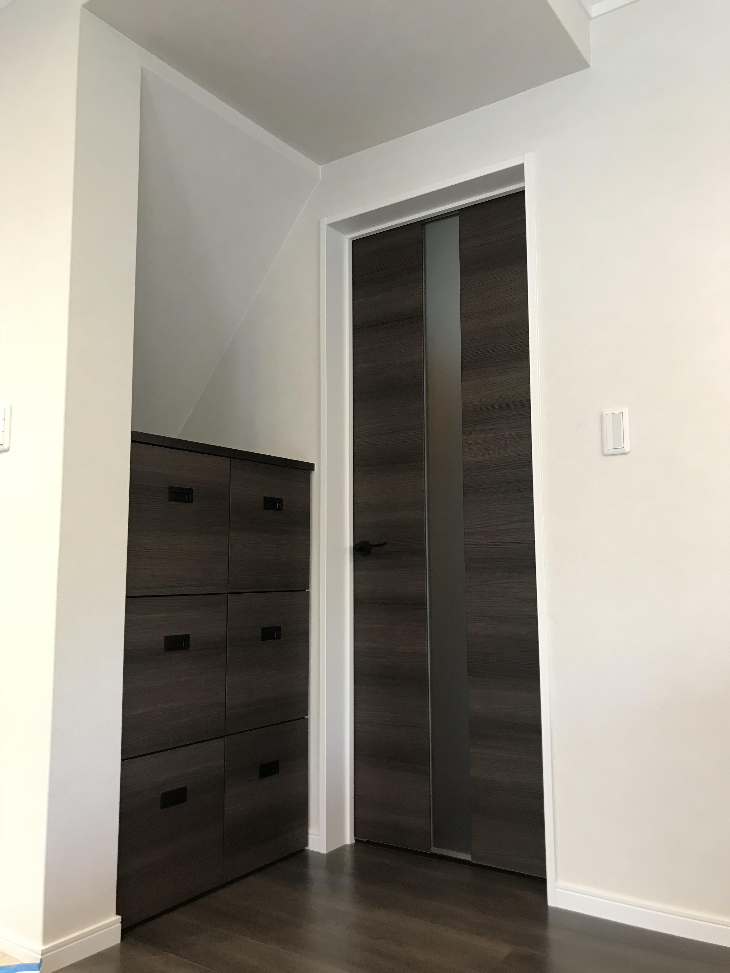 玄関を開けると出迎えてくれるのが、岡島オリジナルのデザイン建具です。お施主様と何度も打合せをして、デザインを決めました。