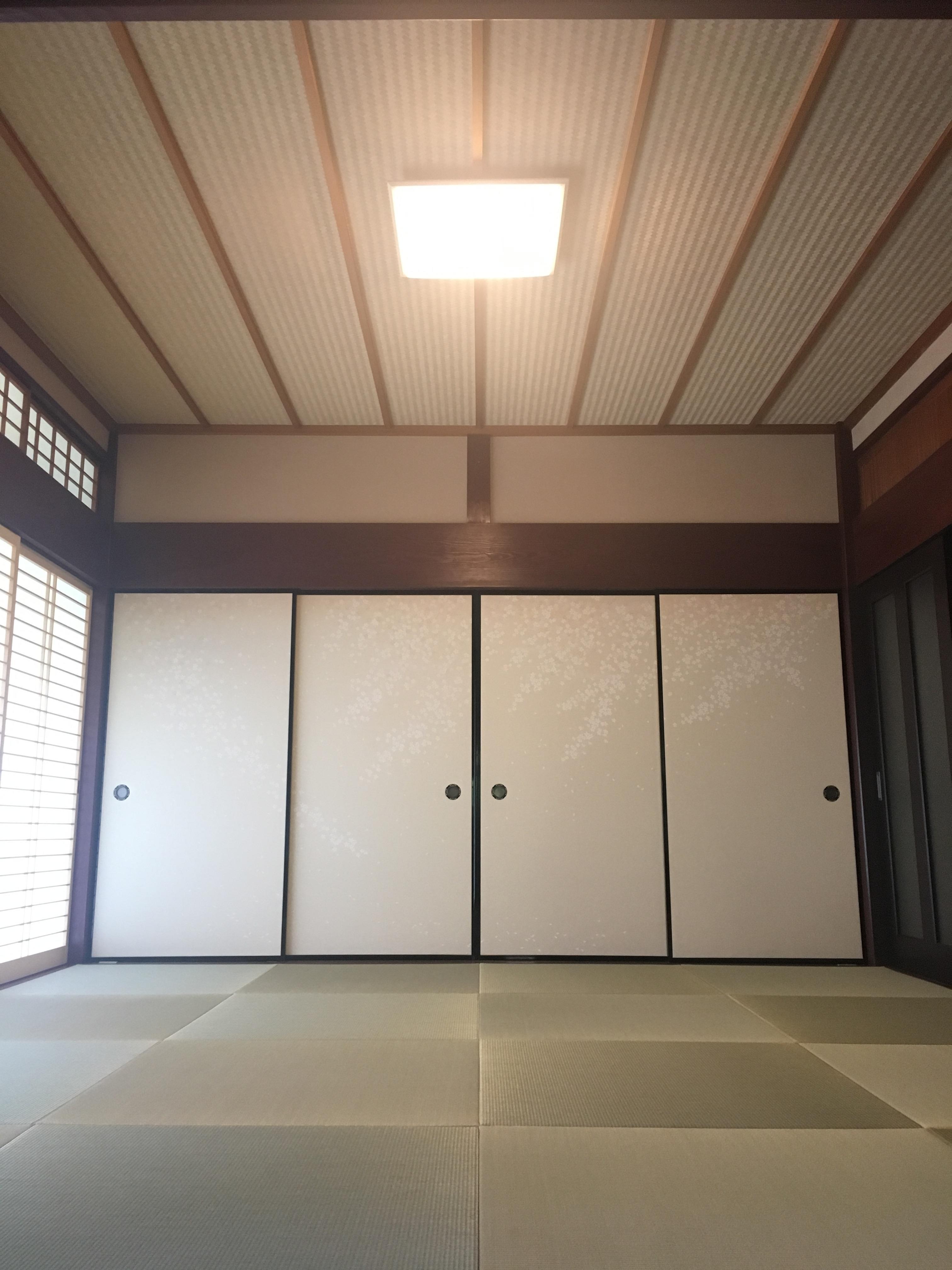 畳は琉球畳に入れ替え、襖紙も張り替えました。天井は竿を残したことにより、流線が生まれ、空間が広々と感じられます。