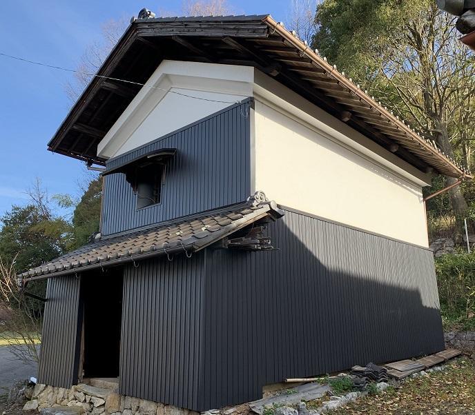 別の所にある蔵の外壁も、張り替えました。白と黒っぽい外壁板金に張り分けたので、新しい中にも重厚感が生まれました。