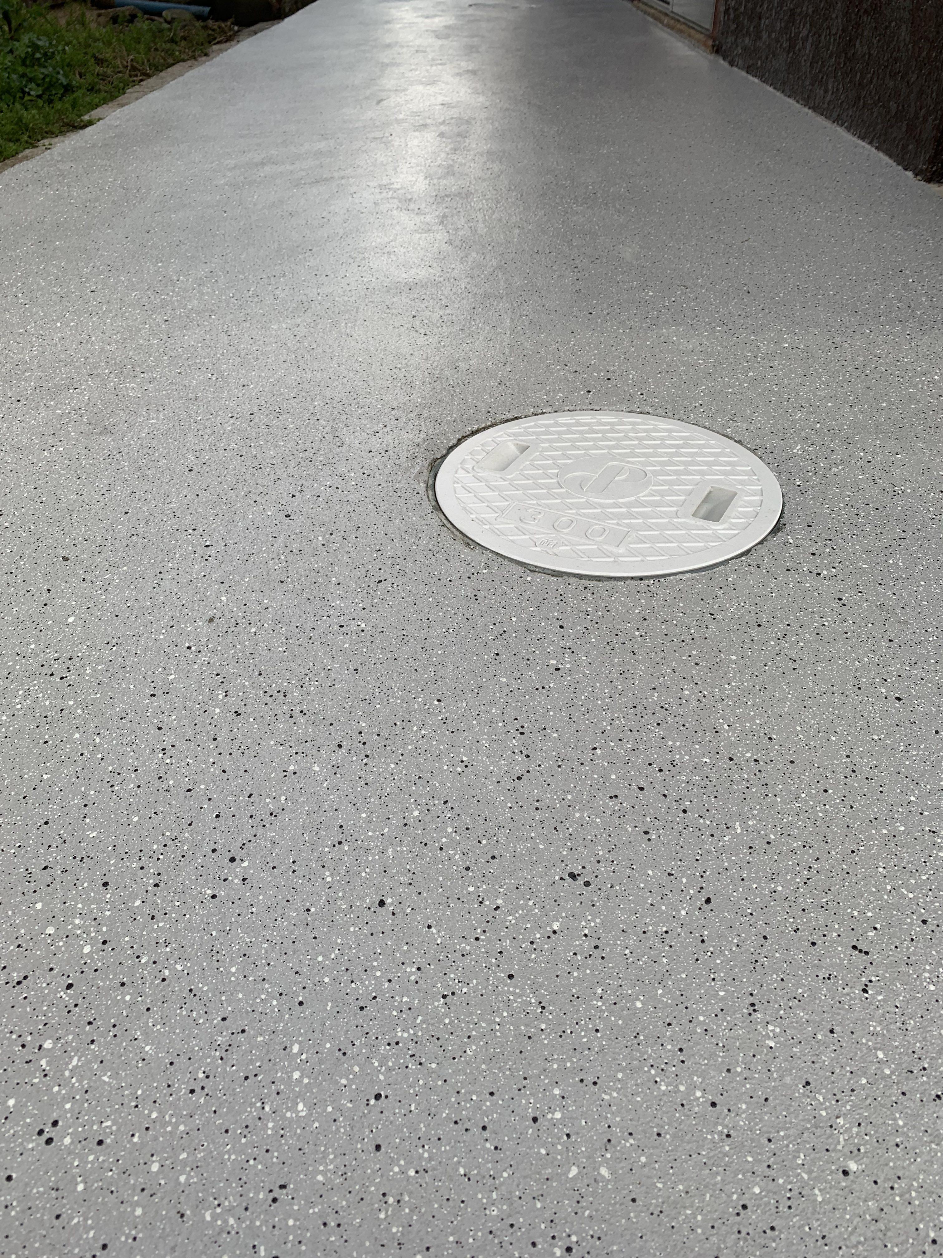 通路部分は土間の塗装をさせていただきました。御影石風の塗装なので、お家の雰囲気にも良くあっていますね。