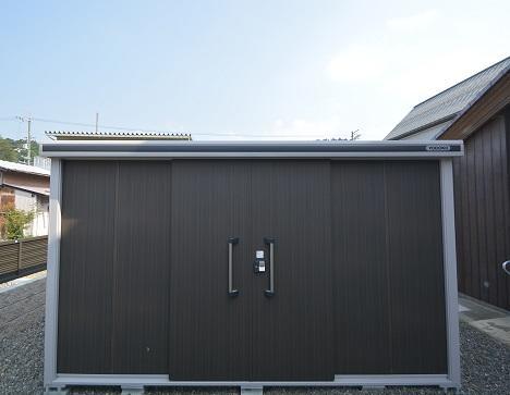 シックな色合いのこちらの物置は、ヨド物置の「エルモ」です。引き分け戸なので、開口広々!カーポートに隣接する形で設置しているので、冬用タイヤの収納にも最適です。