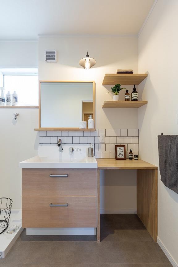 少し広めの洗面所には、奥様こだわりのお化粧スペースを設けました。鏡の下の小さなカウンターには、身支度の時に置き場に困りがちなヘアゴム、コンタクトレンズなどを仮置きできます。