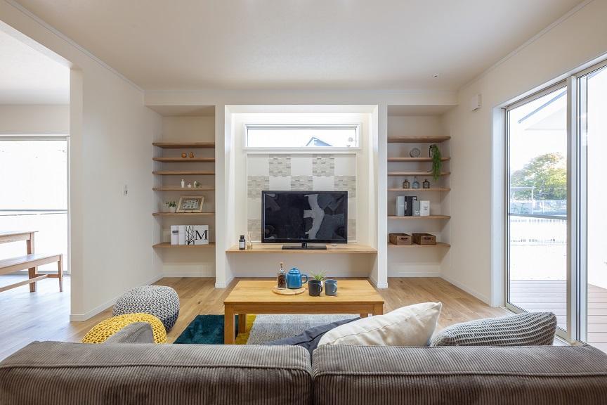 リビングのオープン可動棚には、お気に入りの雑貨や本をそのまま「飾る」だけでなく、お好みのカゴなどに常備薬や身だしなみグッズなど見せたくない物を「仕舞う」こともできます。
