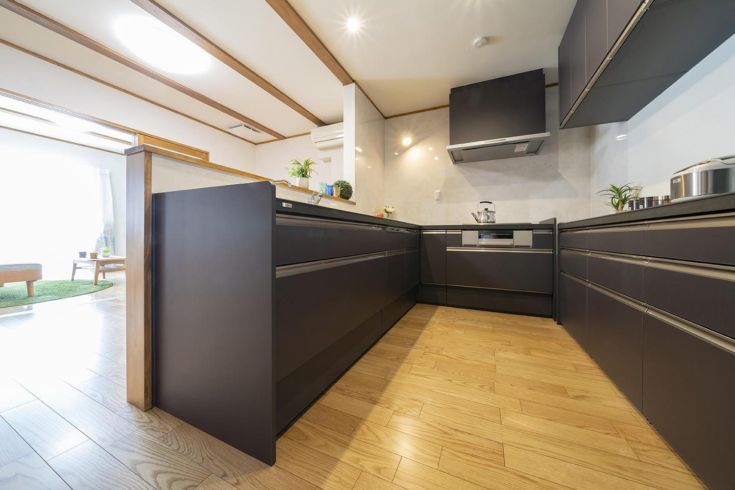 ゆとりのあるL型のキッチンは、ご家族で料理を楽しめる広々としたスペースを確保。セラミックトップを採用し、調理のしやすさもぐんと上がりました。