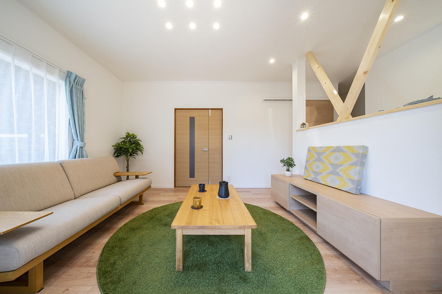 間取りの中央にある対面キッチンに立ちながら、ご家族を見守ることができるよう、壁を撤去。同時に耐震性を保つため、リビングには大きな筋交いを取りつけました。