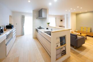 帰宅時は買った物をすぐに冷蔵庫へしまえるよう、キッチンはシューズクロークからも出入りができる動線となっています。