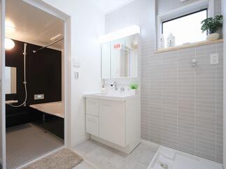 淡い色のキッチンや、折り下げ天井の木目調クロス、脱衣室のタイル調クロスなど、北欧風の内装で統一しました。