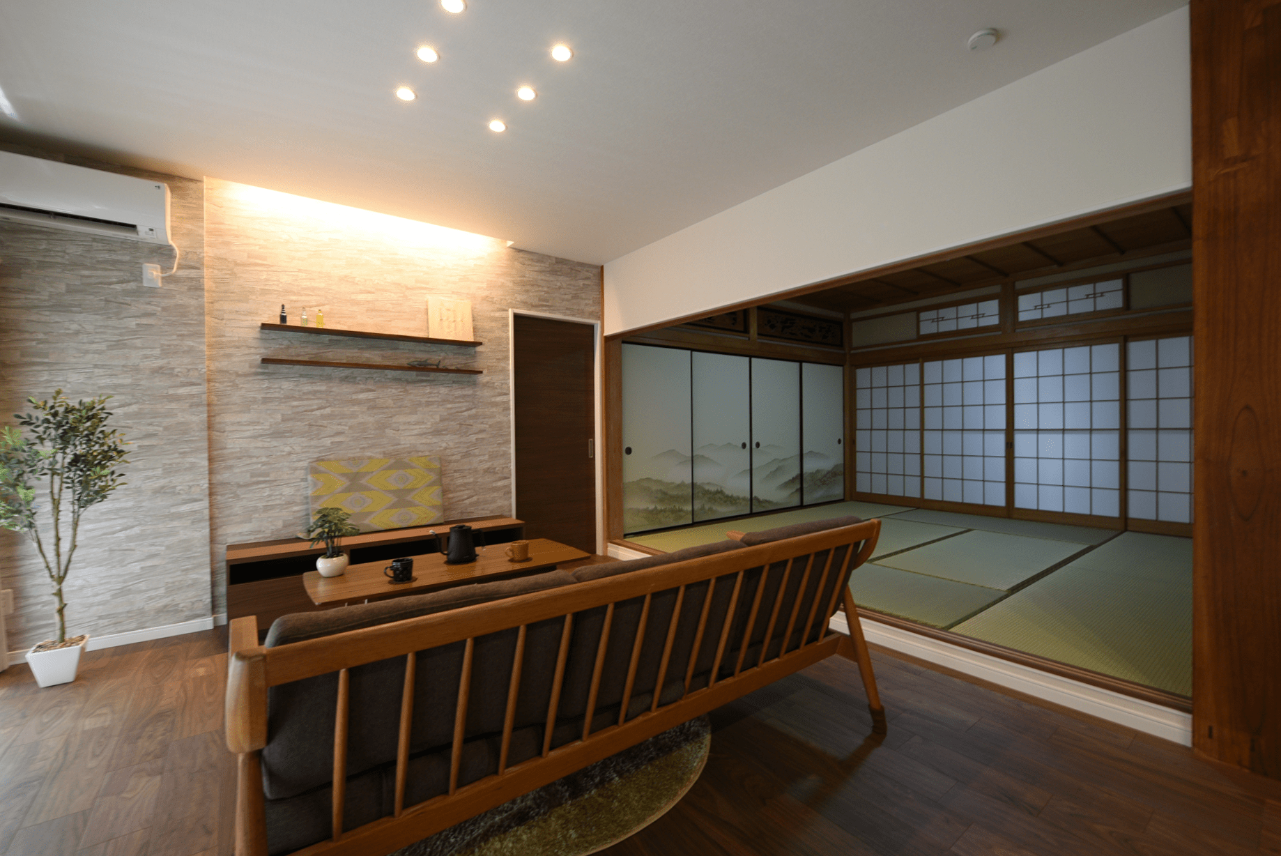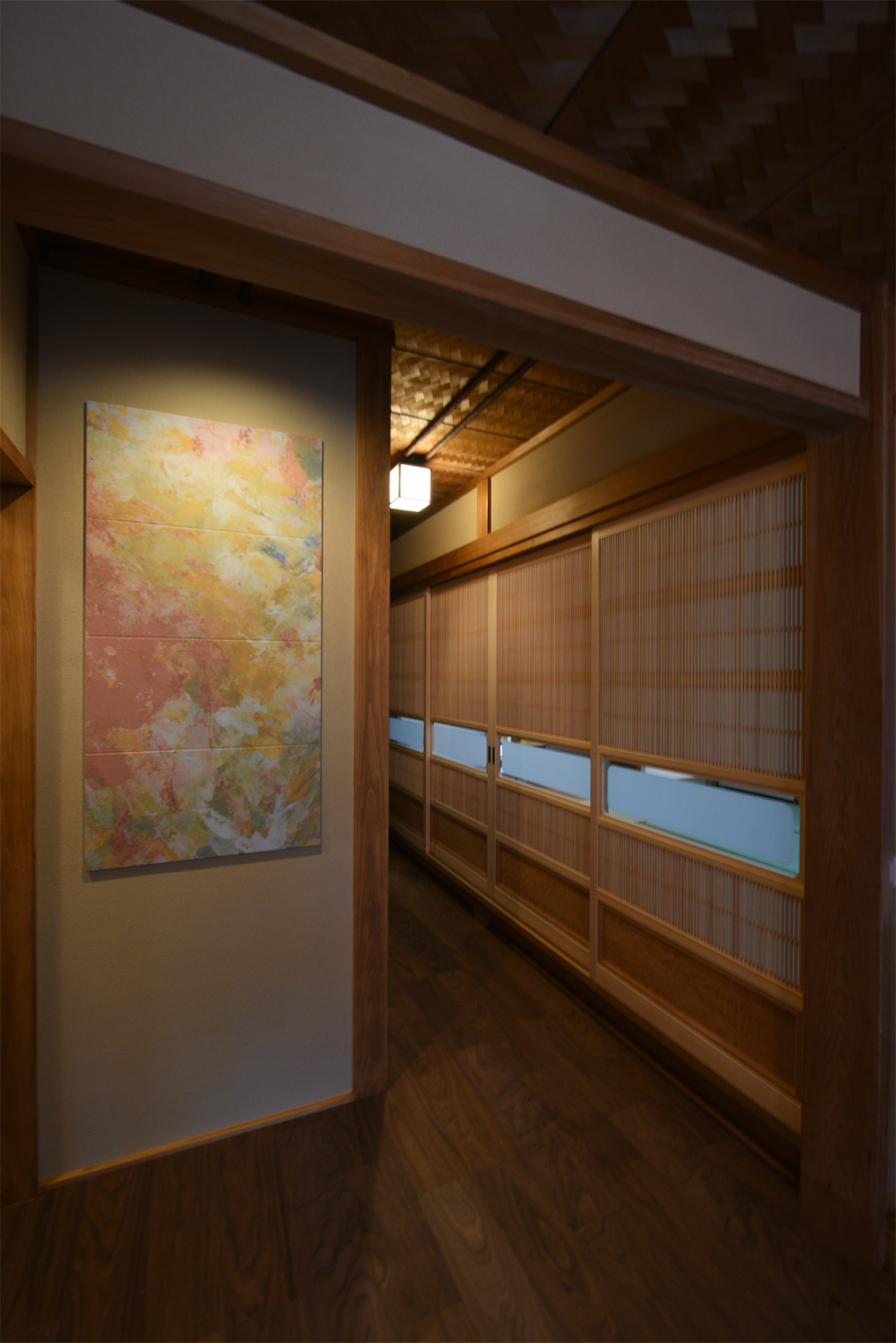 和の雰囲気を引き立たせるため、廊下・和室間の建具は弊社オリジナルの大阪障子を採用しました。障子の一部を取り外せるため、風を通すことができます。