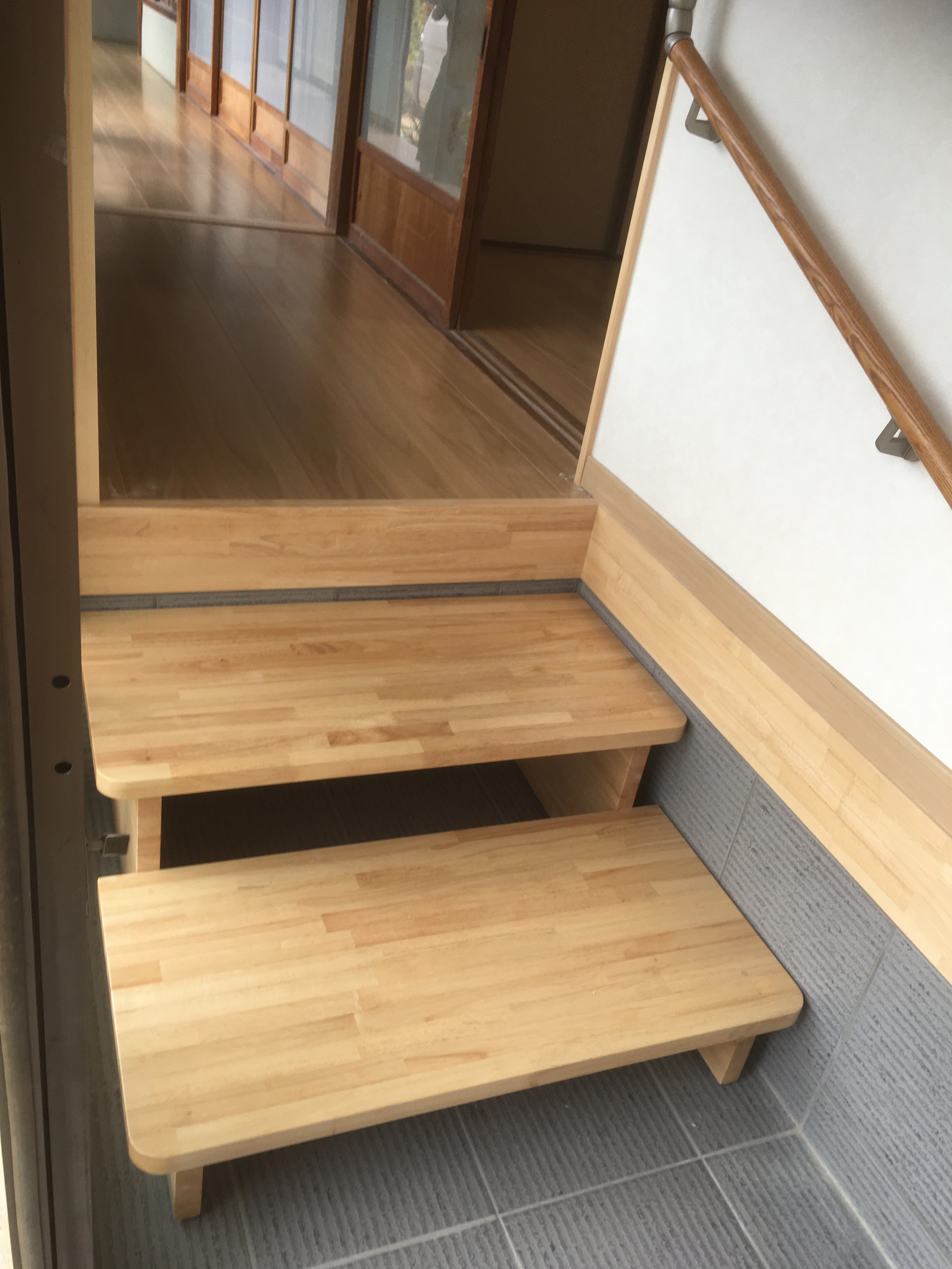 玄関収納を新たに取付し、廊下に上がりやすいように踏み段を作っておきました!もちろん、この踏み段は施主様の息子さんでもある、大工さんお手製の踏み段です♪掃除がしやすいように、持って移動が出来るように据え置きにしました。また、上がり降りしやすいように、手摺を付けて安全面にも配慮です。