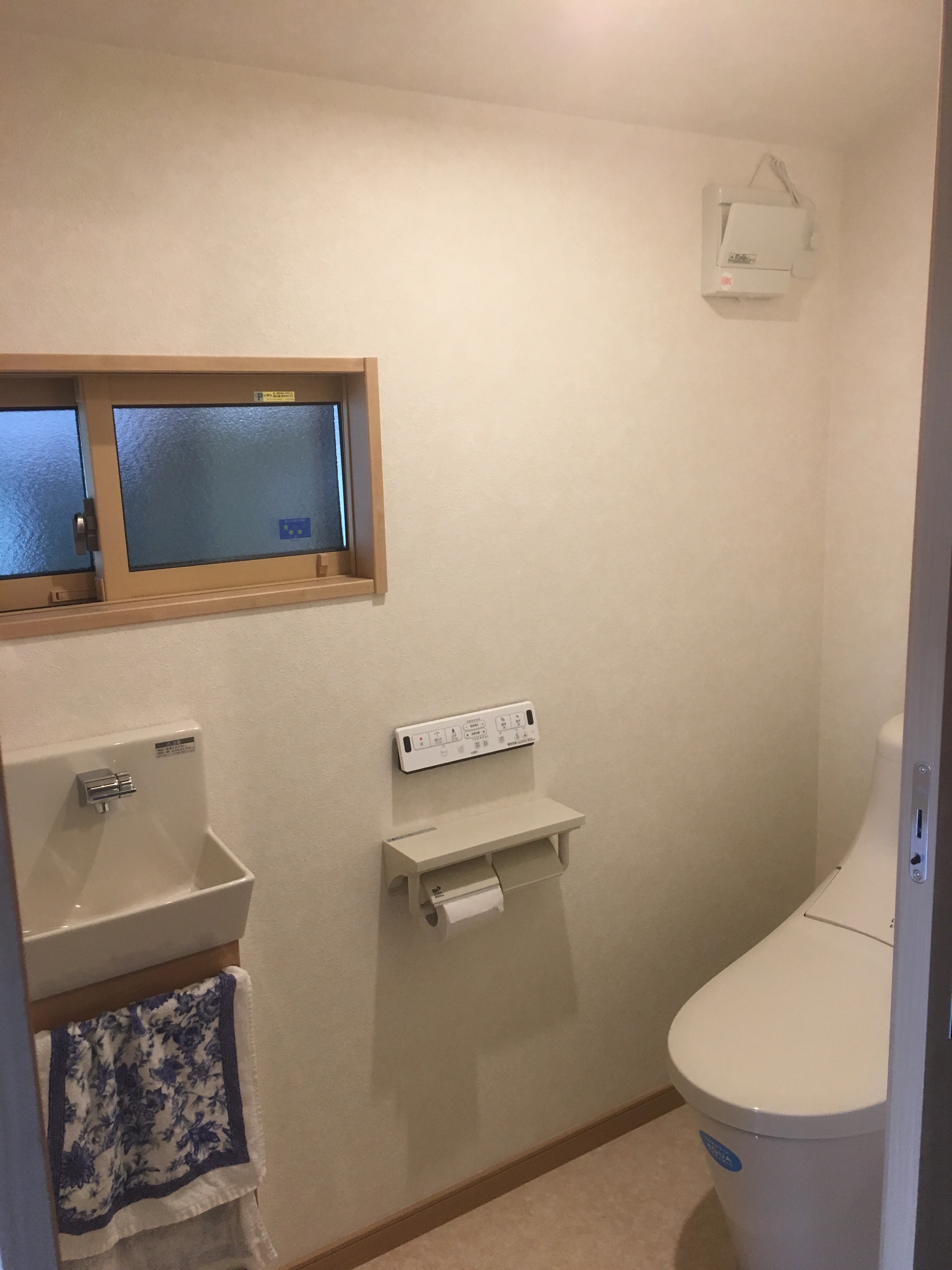 新しいトイレは、大小を一つにまとめました。LIXILのベーシアタンク付きを使用し、手洗い機のコフレルを付けました!2016年4月から、トイレの便器が新しくなり、汚れが付きにくく流れやすいので掃除が一層楽になりました♪