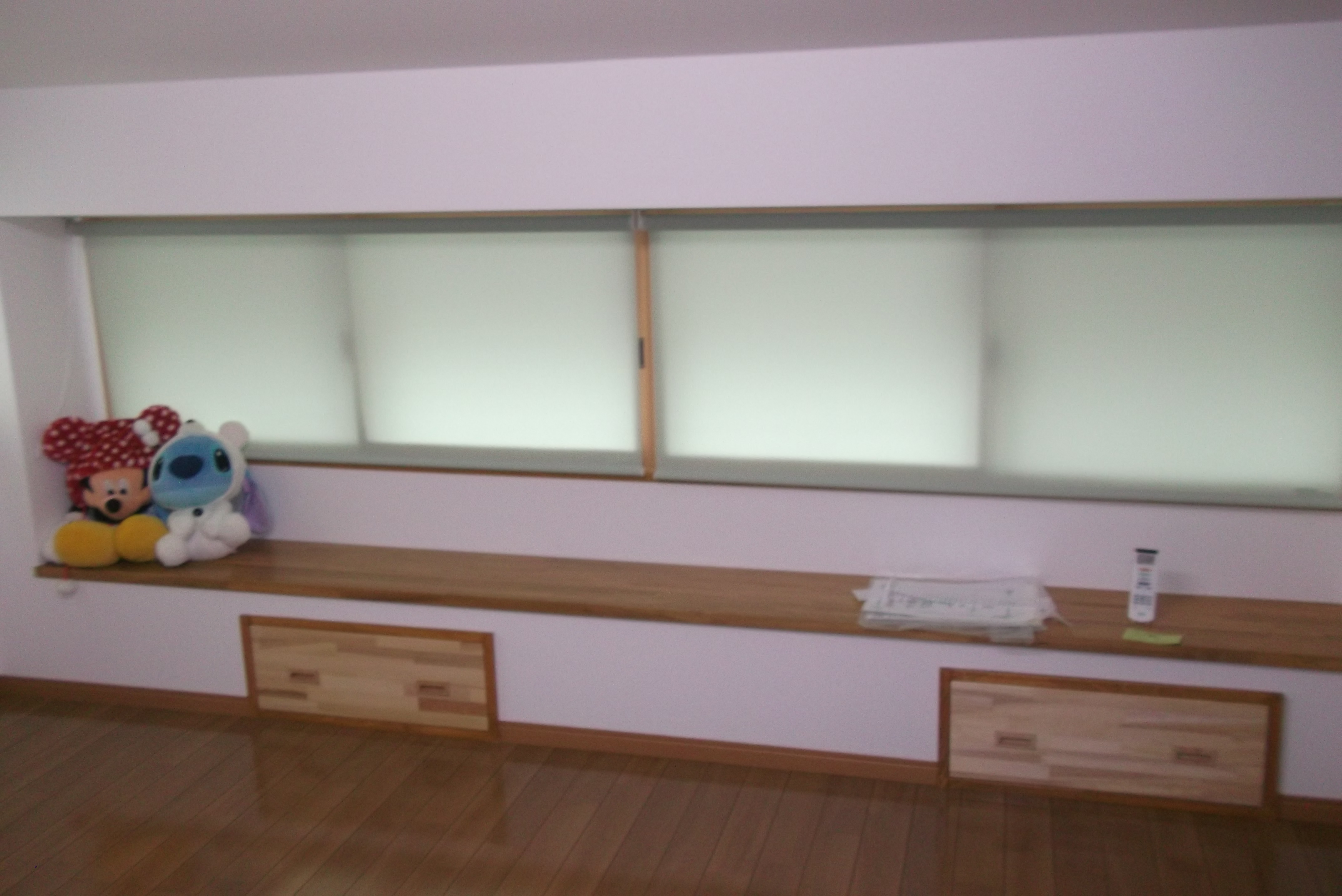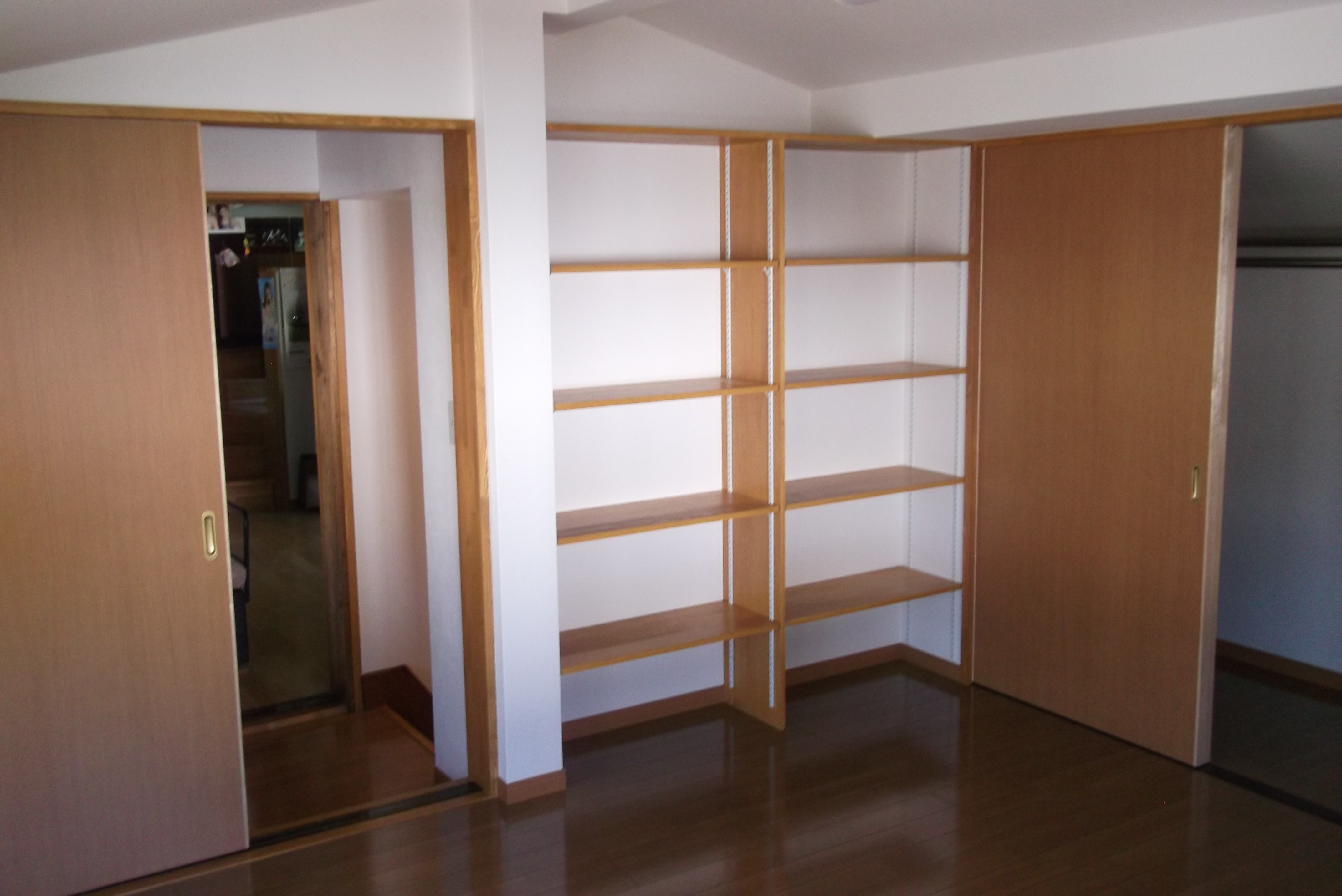 築60年位になる2階の部屋を、受験勉強に励む中学の娘さんの子供部屋にリフォームしました。和室だった部屋は、クロスの張り替えや収納スペースを確保することで、明るく使い勝手よい洋室に生まれ変わりました。 [▲写真上] 造りつけで本棚を設置、棚は可動式です。 [▲写真右下] 出窓下の空間を利用し引き出しを作り付けました。