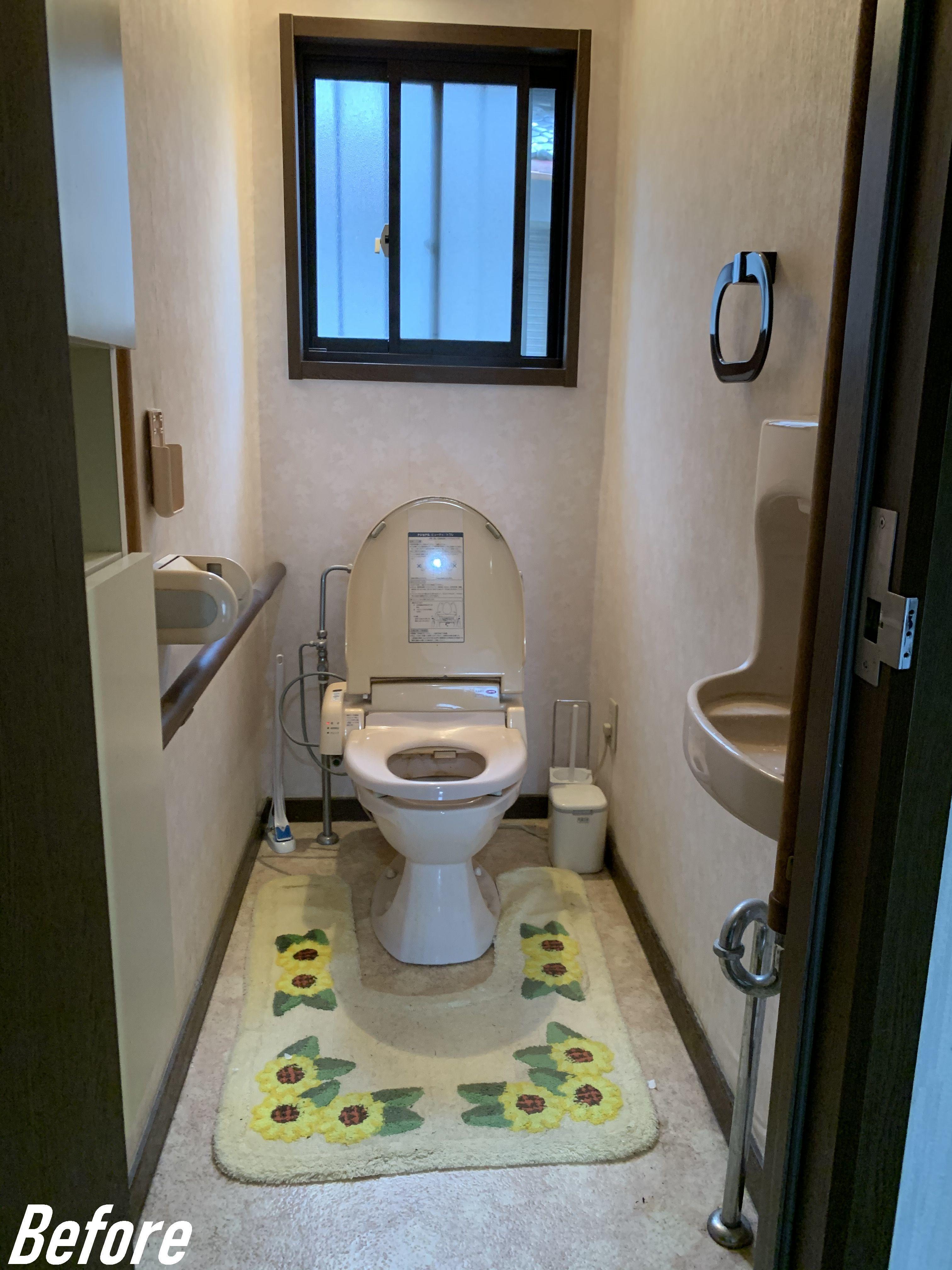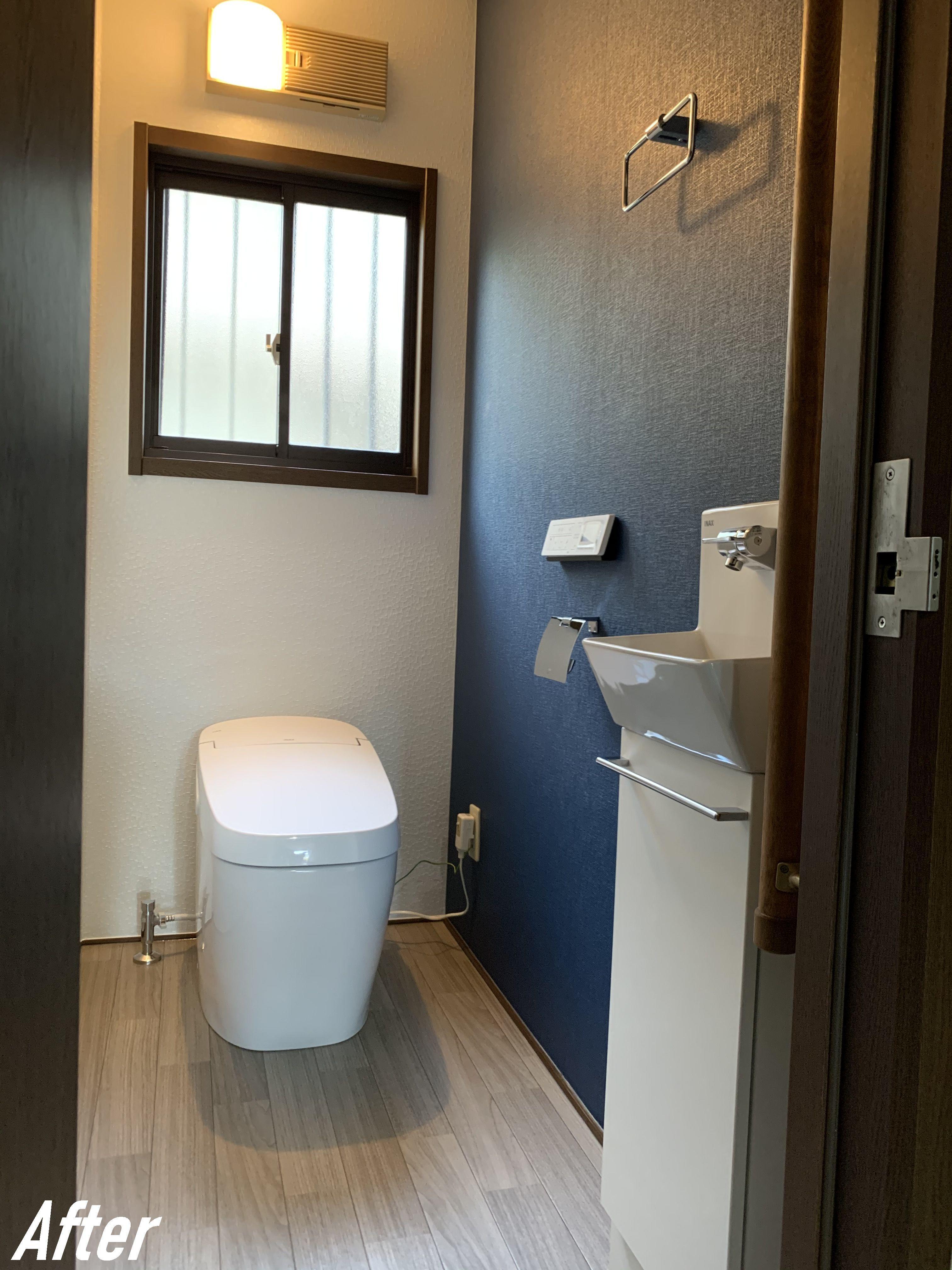 トイレはサティスGタイプにすることによって見た目のスッキリさとスペースもゆったりとることができました。 床のクッションフロア、天井・壁クロスの貼替。壁クロスを変えることでアクセントになっています。 内装も一新して素敵な空間になりました。