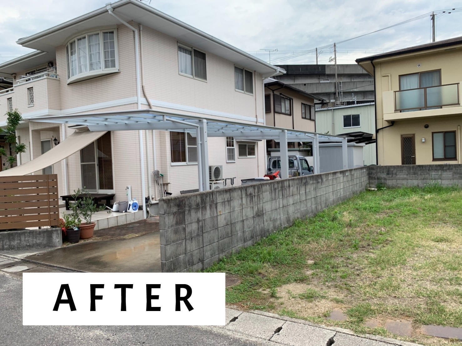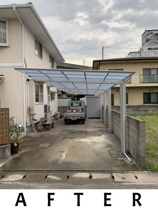 カーポートリフォームです。 古くなったカーポートを撤去し、敷地奥までカーポートを伸ばします。 土間コンクリートを斫った所は、自作のブロックで一工夫!