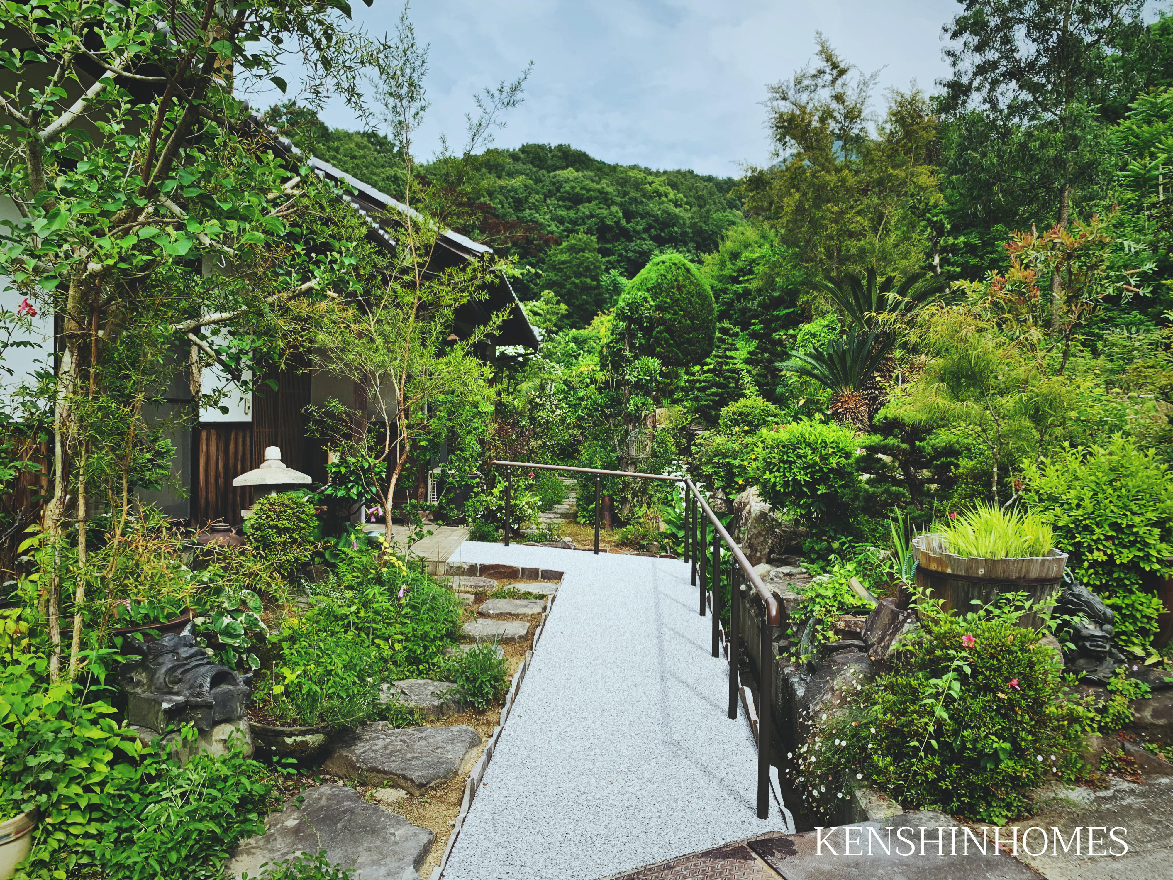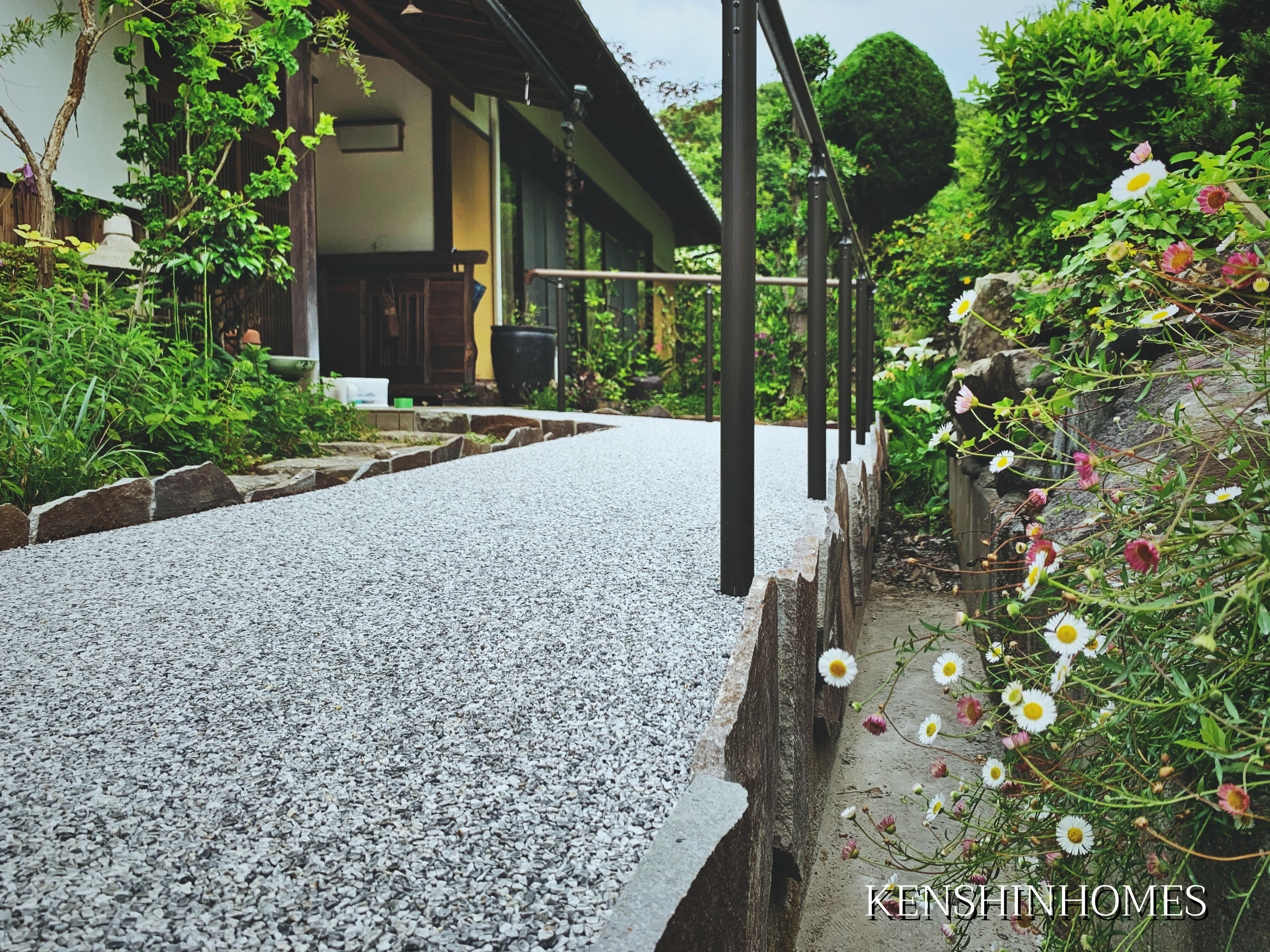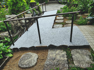 飛石があり足場が少し悪かった玄関アプローチにスロープを新設しました。また、手すりも取り付けることにより、ご年配の方でも安心して移動できるようになりました。