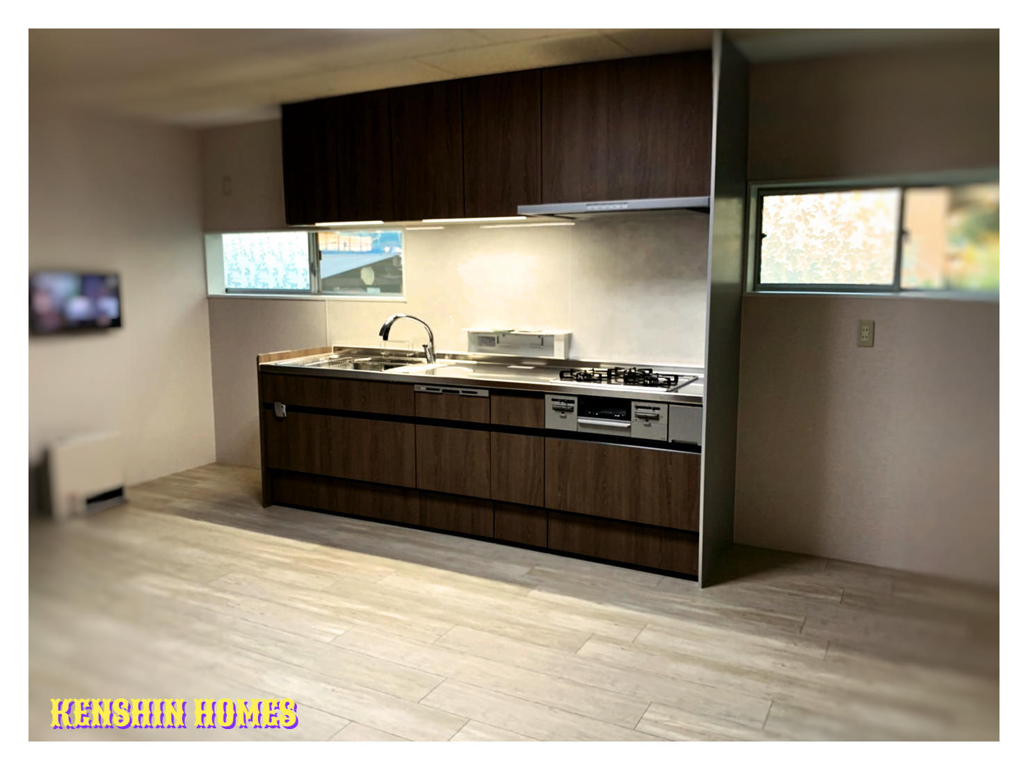 古くなったキッチンを、取り替えました。 壁は、昔ながらのタイル壁で掃除が大変です。 タイルからキッチンパネルで油が飛んでもひと拭きでメンテナンス簡単! 床も貼り替えてとてもシック、居心地の良いキッチンダイニングに生まれ変わりました。