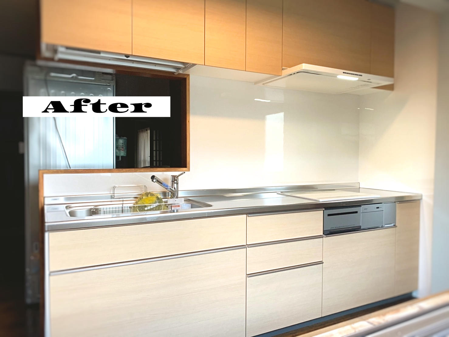 キッチンリフォームです。 お掃除にしにくタイルからキッチンパネルに変更しました。 お施主様からは、色も白色に変えた事で室内が明るくなりとても喜ばれました。