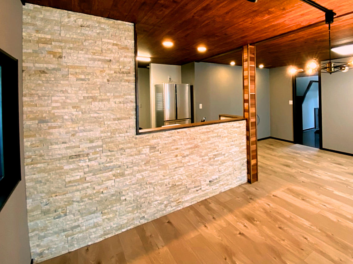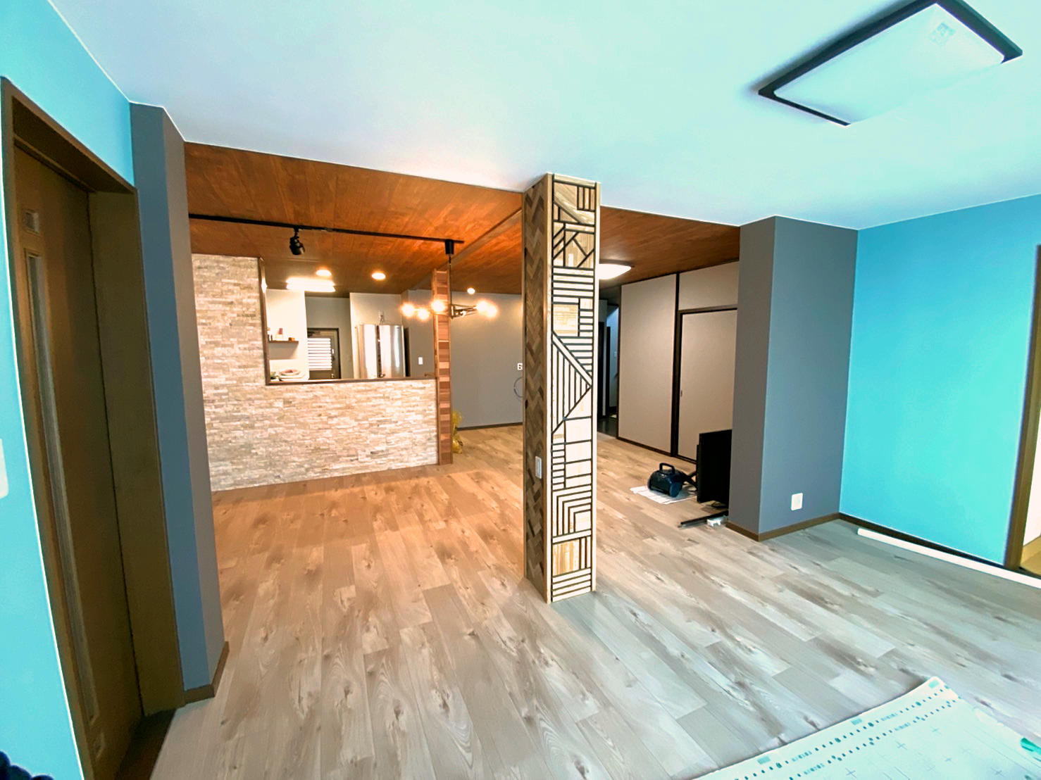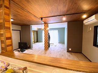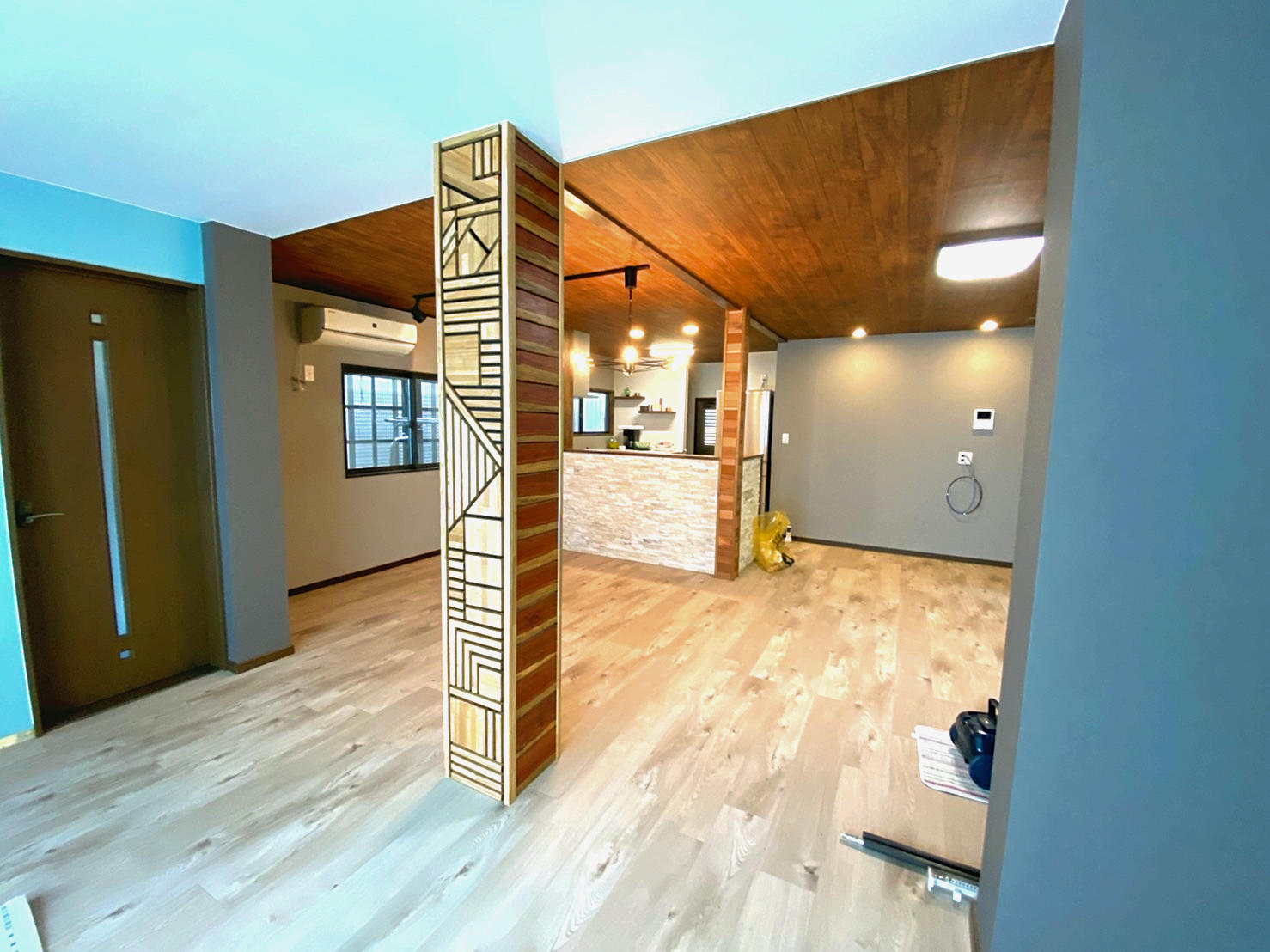 リビングの真ん中に大きなモニュメント?を解体し部屋全体を見渡せるLDKにリフォームしました。 キッチン前の壁にロックタイル、柱にレッドシダ貼り、大黒柱に4面ともデザインが違う木組みを施しとても良い空間になりました。 4面とも違うデザインの柱、インスタグラムに詳細有りますのでチェックしてみて下さい。
